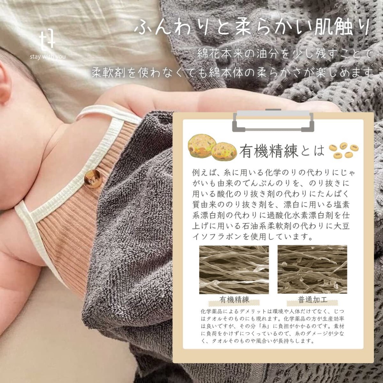 【敏感肌の方・赤ちゃん向け】生産過程で化学薬品をほとんど使っておらず、出荷前に繰り返し水洗いをして仕上げられているので届いた時からお肌に優しい風合いです。赤ちゃんやお肌の敏感な方でも安心してご使用して頂けます。