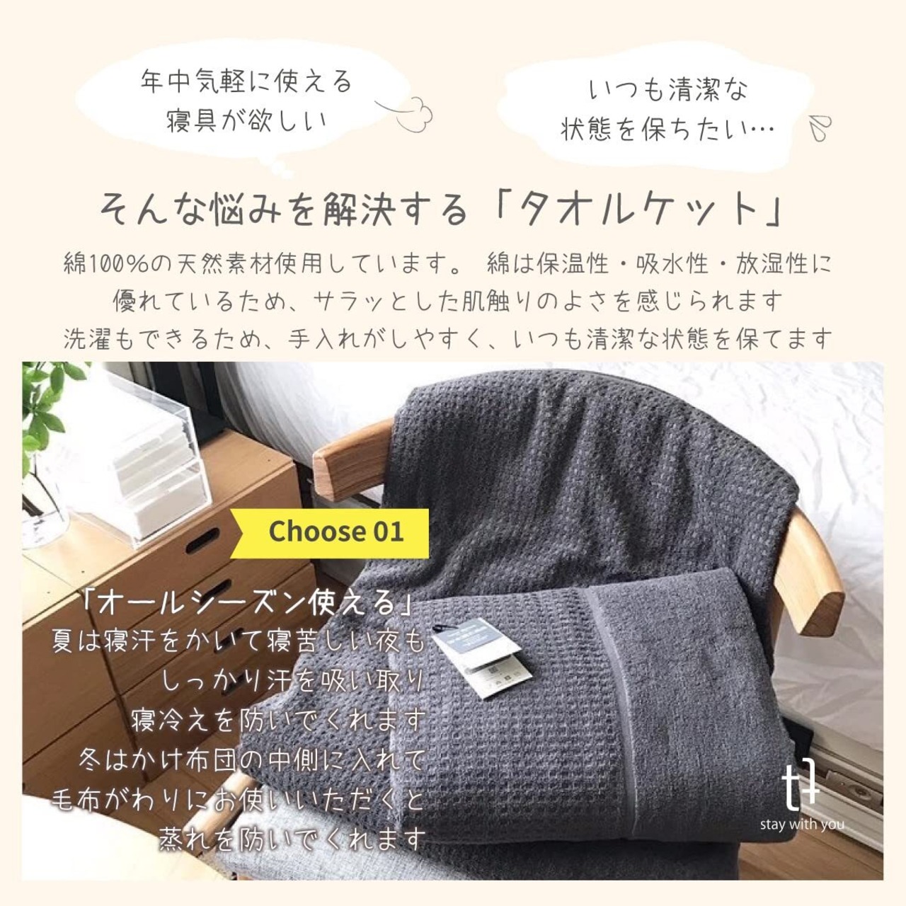 【蒸れにくく気持ち良い寝心地】ワッフル生地の構造と天然素材の綿の特性によって適度に汗や湿気を吸ってくれますので、夏はもちろん年中快適にご利用頂けます。