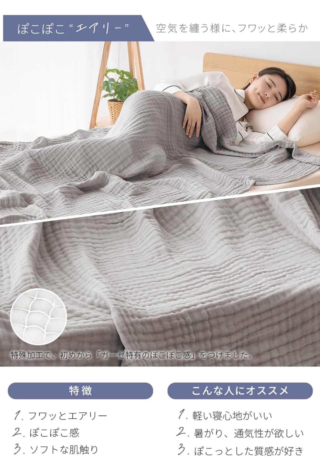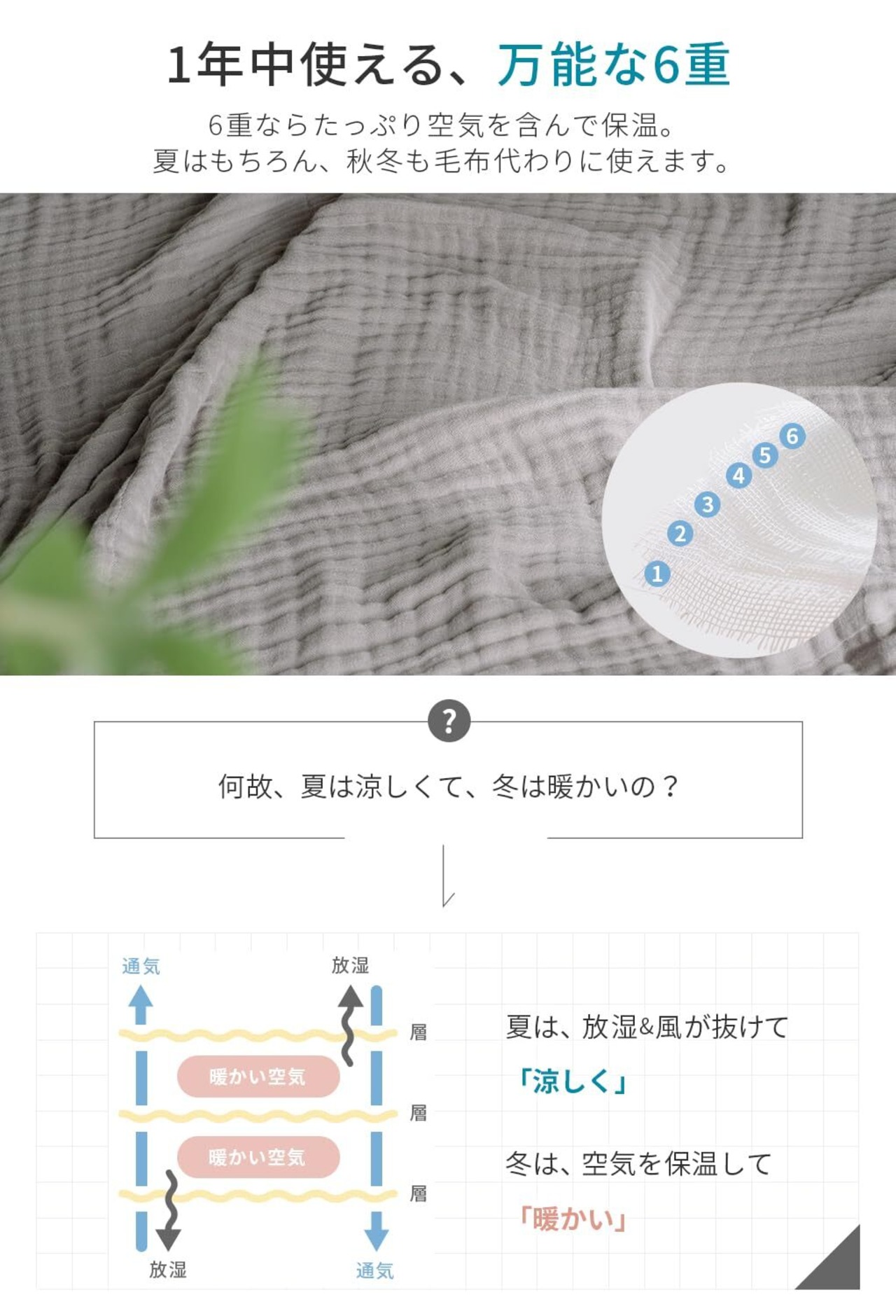 【冷房対策】心地よい眠りを誘う6重ガーゼ。ガーゼ生地を6重にしたことでやわらかい肌触りと、適度な通気性を実現。春から夏にかけて長くお使いいただけます。夏場の冷房対策、熱帯夜でも快適にお使いいただけます。