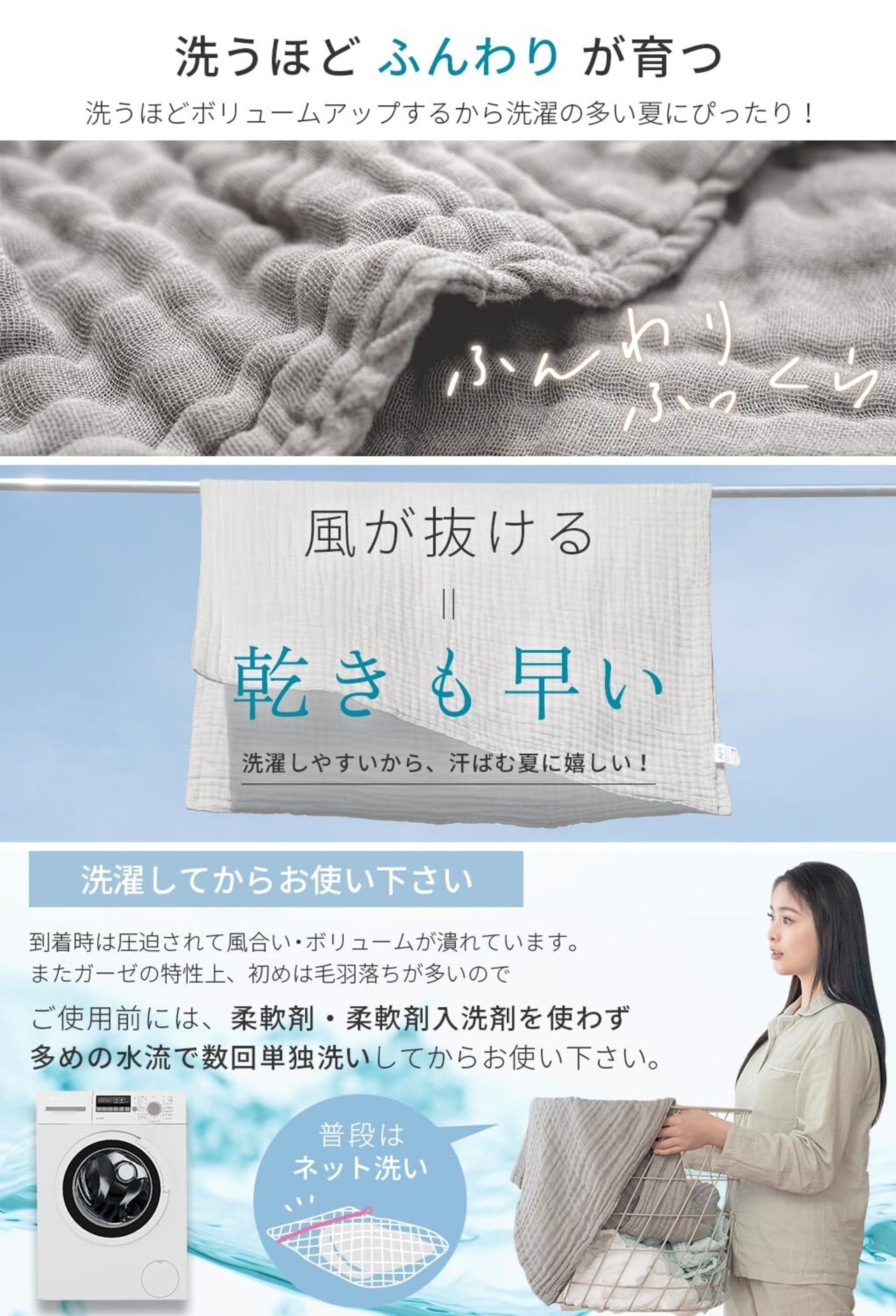 【洗濯機対応】洗うたびにふんわり育つ。洗うほど使い込むほどにふんわり優しく育ちます。肌なじみがよく、タオルケットとはまた違った風合いも魅力のひとつ。縫製のあとの洗浄でシワを丁寧に作っていきます。洗浄時に計算された時間と水温で洗うことによって肌にちょうどよくなじむ、くしゅくしゅ感が生まれます。※ご自宅で洗濯ネットに入れ洗濯可能!
