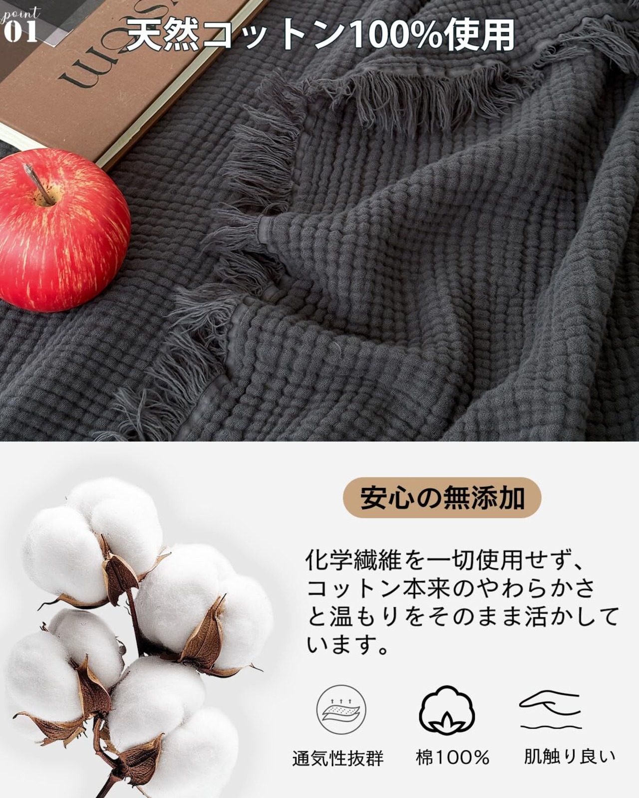 【厳選された天然コットン100%使用】VCGUDOEのガーゼケットは化学繊維を一切使用せず、コットン本来のやわらかさと温もりをそのまま活かしています。ふわふわな肌触りは、まるでタオルケットやバスタオルを超える心地よさ。敏感肌の方や赤ちゃんにも安心してご使用いただけます。