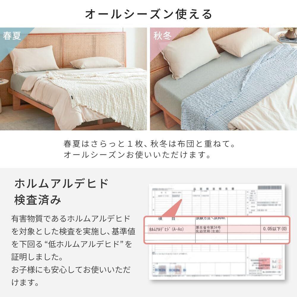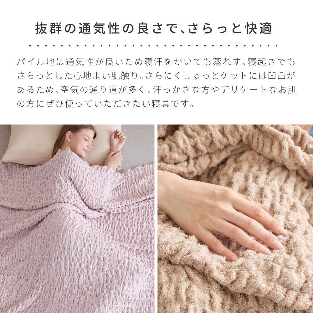 適度な保温性でオールシーズン使えます。たくさんの空気を含み、寒い季節でも掛け布団と一緒に使用することで蒸れずに暖かさを逃がしにくい構造になっています。どんなお布団でも相性がいい、優れモノのケットです。