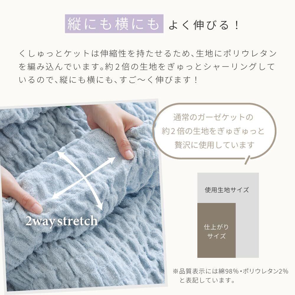 縦にも横にもよく伸びる!くしゅっとケットは伸縮性を持たせるため、生地にポリウレタンを編み込んでいます。約2倍の生地をぎゅっとシャーリングしているので縦にも横にもすごく伸びます!