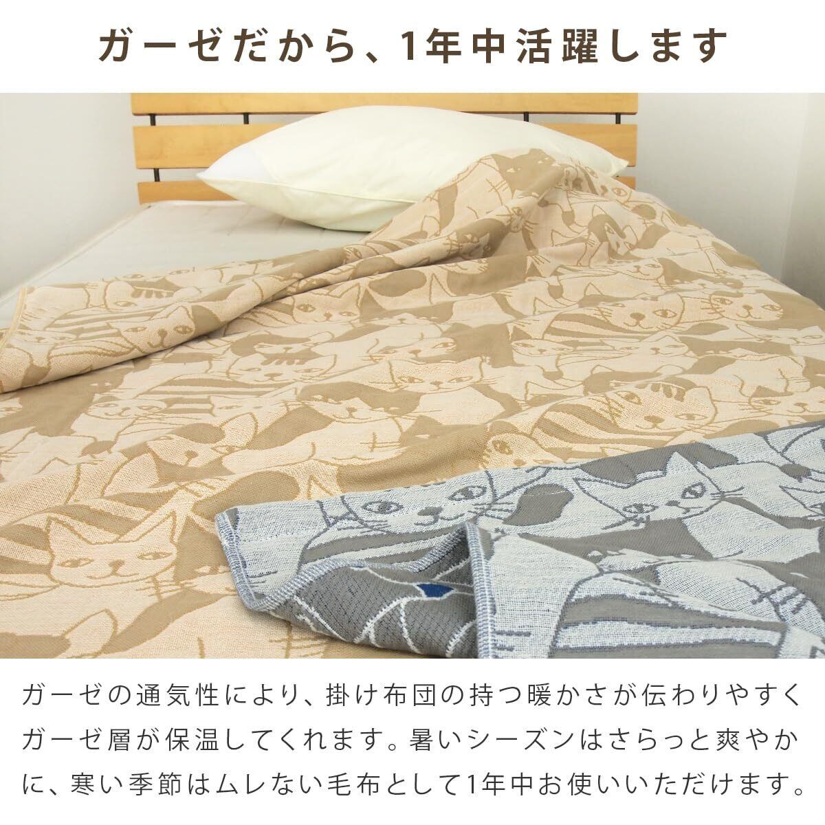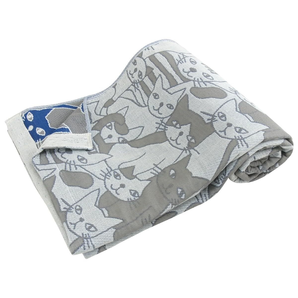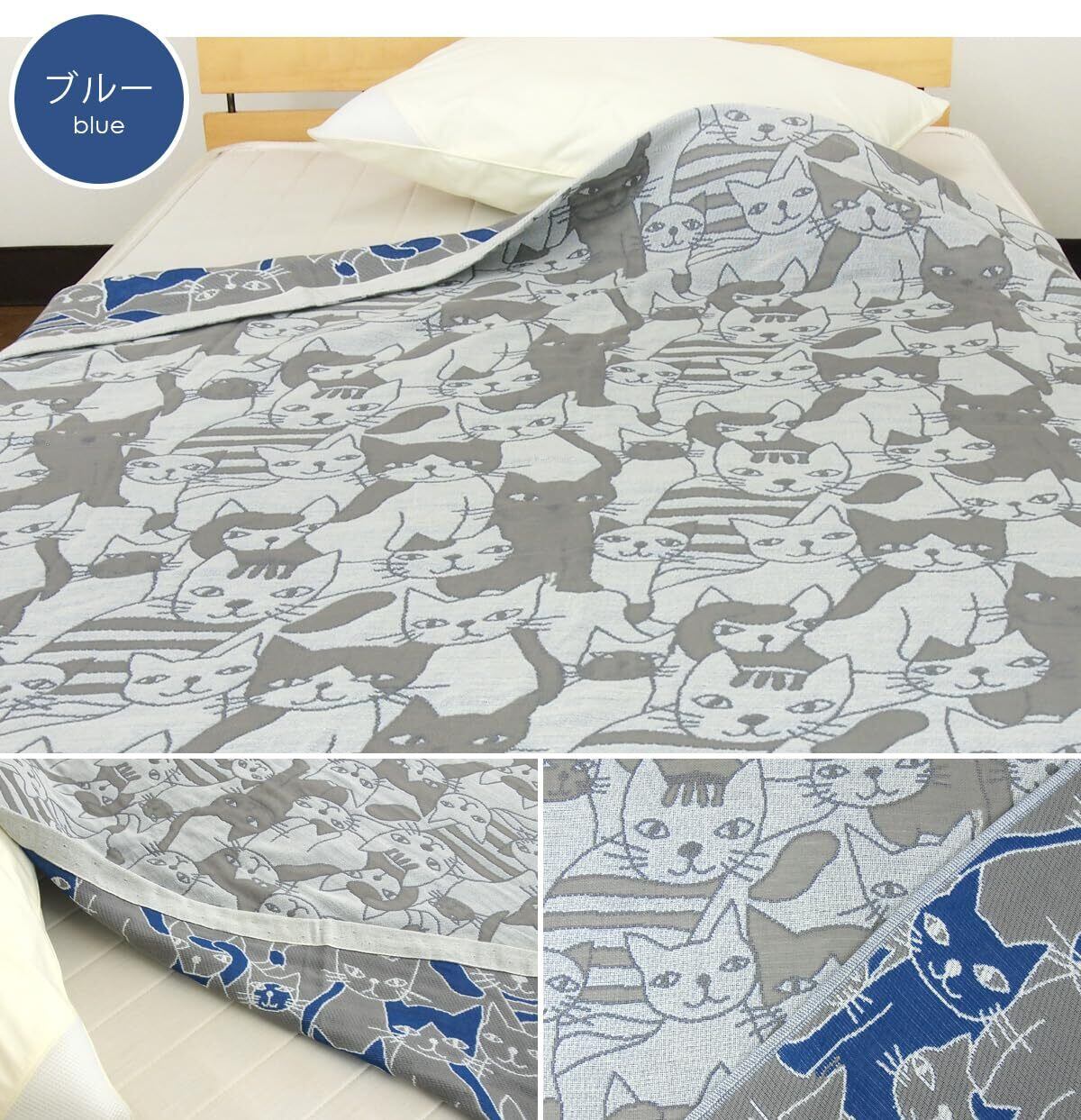リヴェール ガーゼケット 3重ガーゼ シングル 猫柄 洗える ブランケット タオルケット 冷房対策 夏用 綿混 (ブルー)