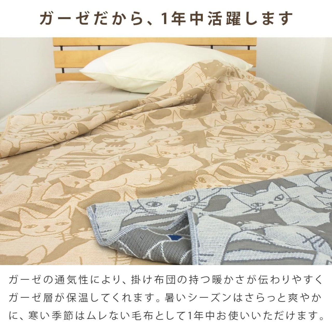軽いので重苦しいさを感じずに、夏場のエアコンからの冷え予防にもなります。需要が高まっている電気毛布との相性が良いのもポイント。静電気が起きにくく、ガーゼの吸放湿性が熱くなりすぎてしまうのを抑えてくれます。夏だけでなく、オールシーズンお使いいただけます。