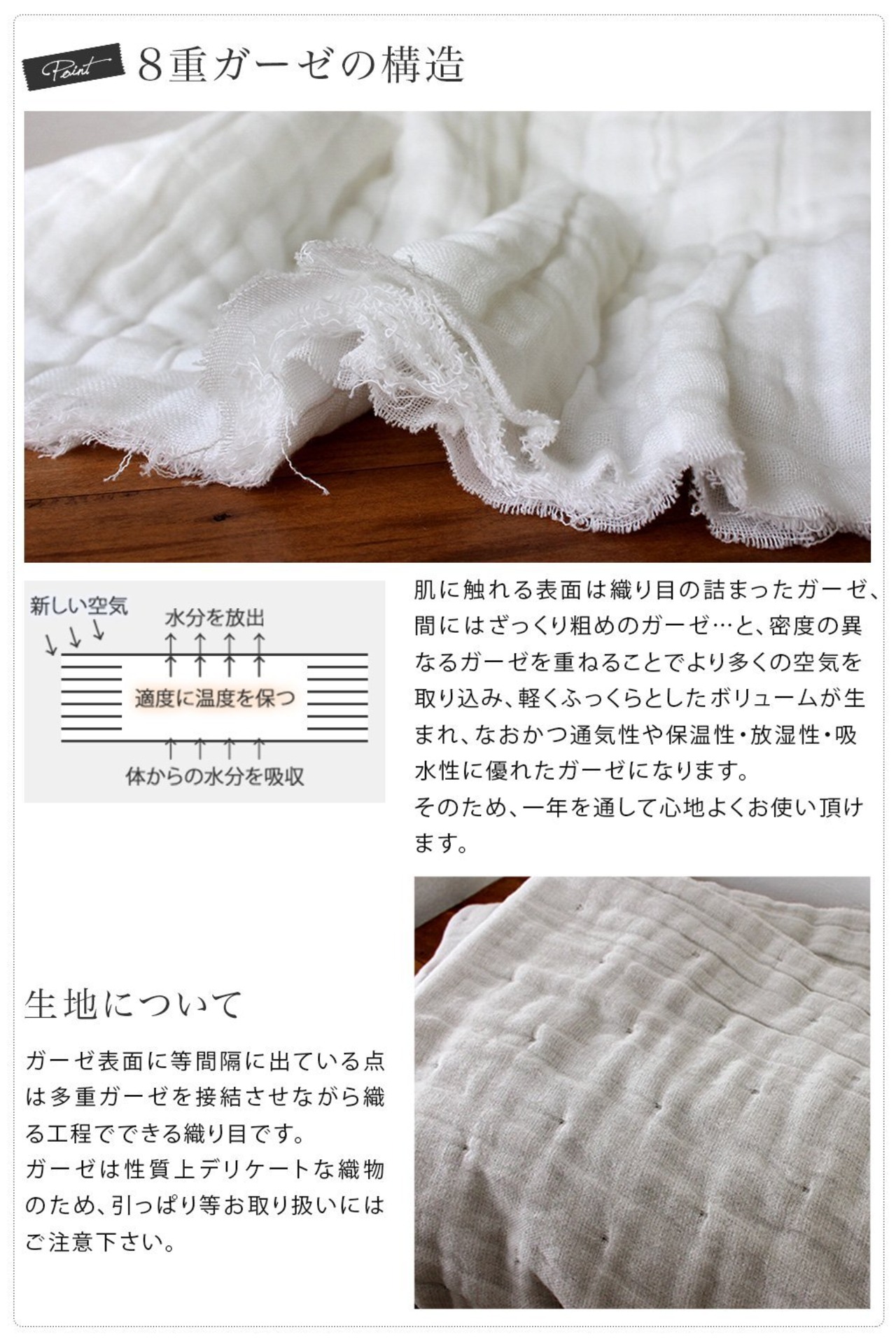 【8重ガーゼの贅沢な柔らかさ】たっぷりと空気を含んだ8重のガーゼで作った、とろけるような肌触りに包まれるガーゼケットです。限られた工場でしか生産できない格別な心地良さです。