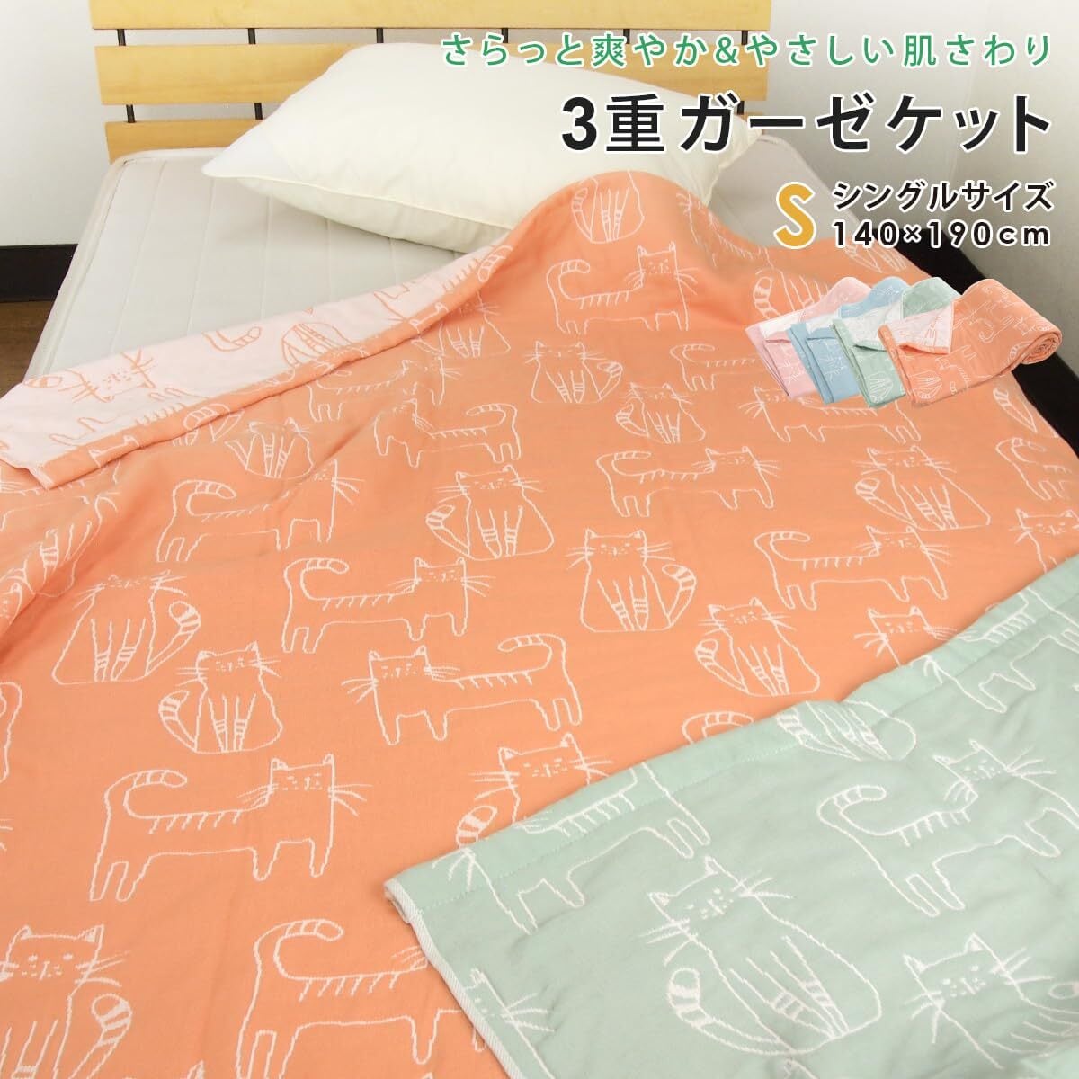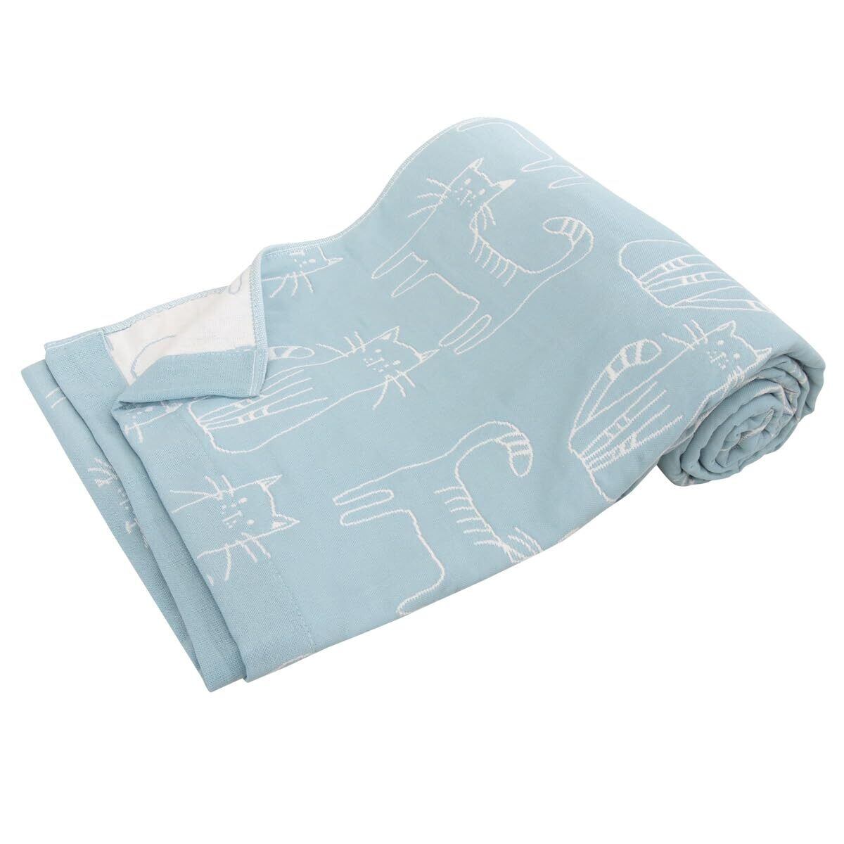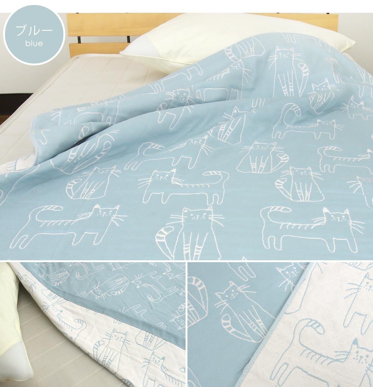 リヴェール ガーゼケット シングル 3重ガーゼ ねこ柄 綿混 ブランケット 夏掛け 肌掛け (ブルー)