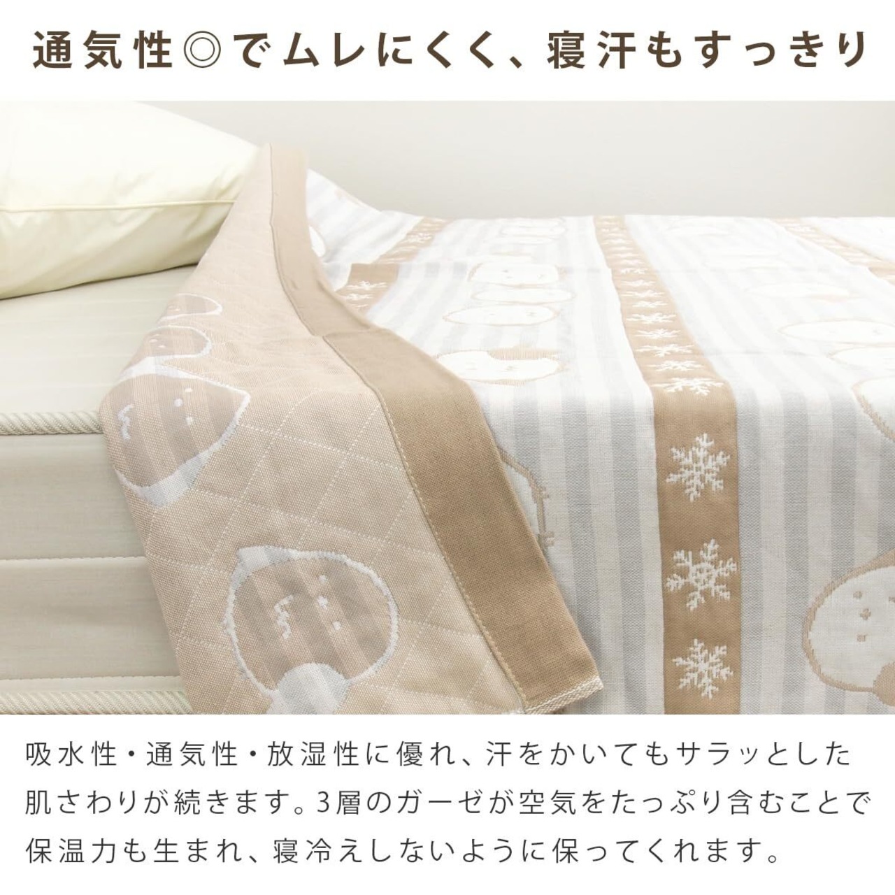 軽いので重苦しいさを感じずに、夏場のエアコンからの冷え予防にもなります。需要が高まっている電気毛布との相性が良いのもポイント。静電気が起きにくく、ガーゼの吸放湿性が熱くなりすぎてしまうのを抑えてくれます。夏だけでなく、オールシーズンお使いいただけます。