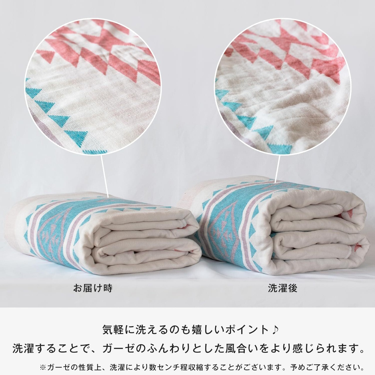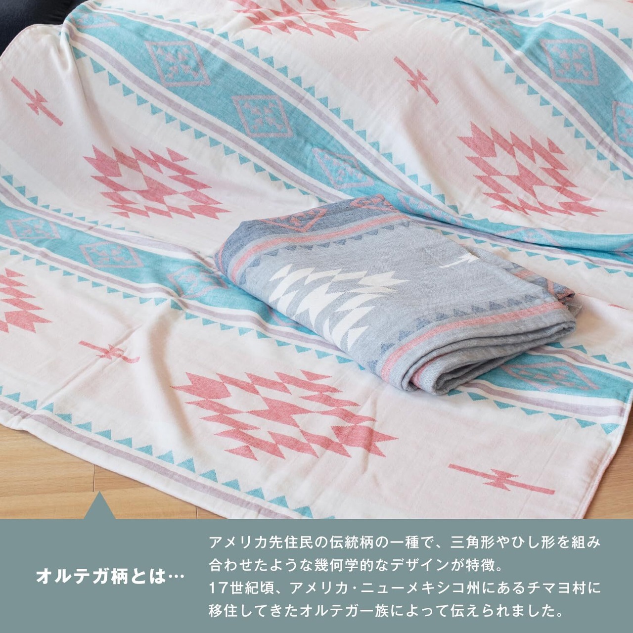 オルテガ柄のデザインが特徴的なガーゼパイルケット。