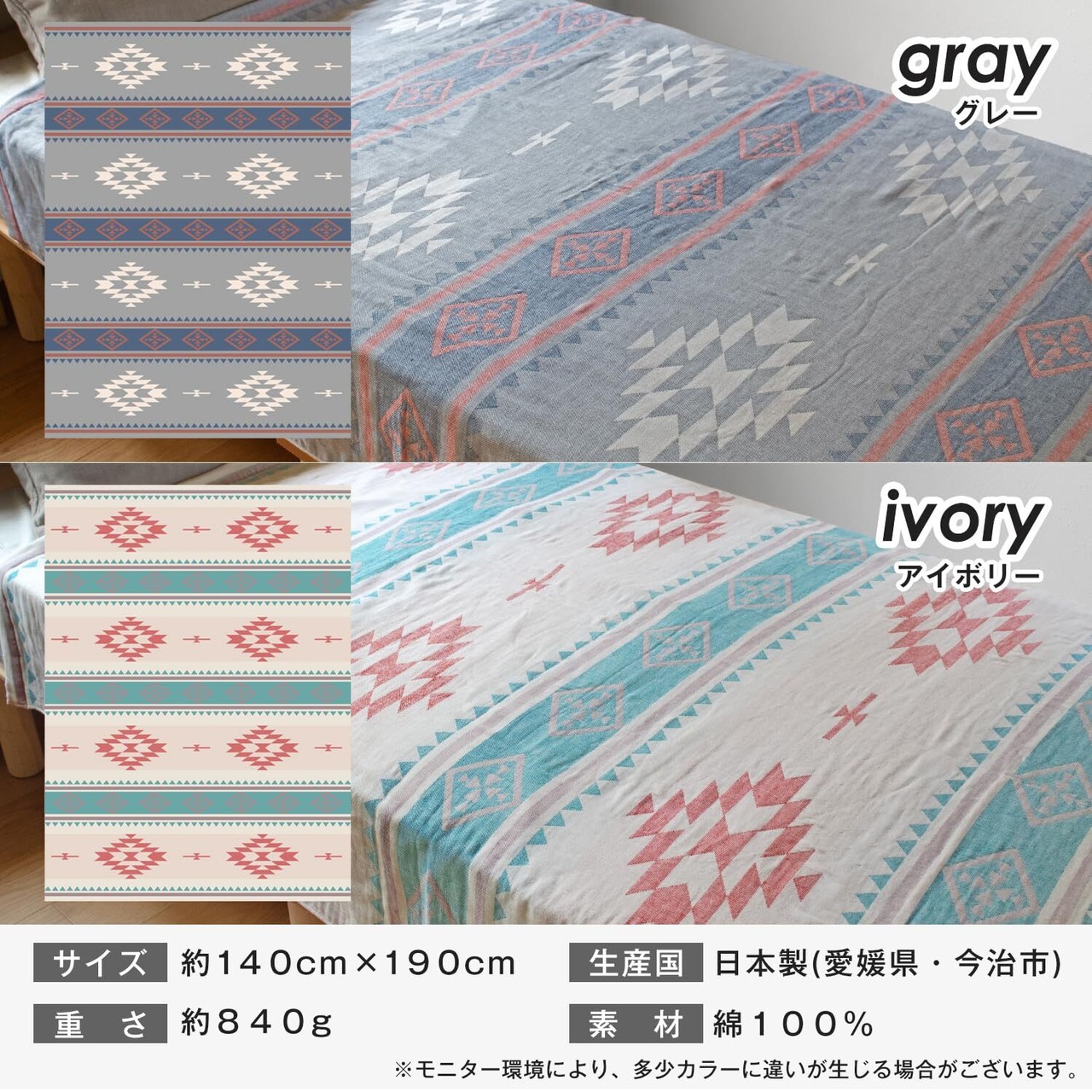 【2025最新】ブルーム 今治産 タオルケット オルテガ353 シングル ガーゼケット ガーゼパイルケット ガーゼ生地 日本製 約140×190cm ネイティブ柄 オルテガ 綿100% (アイボリー)
