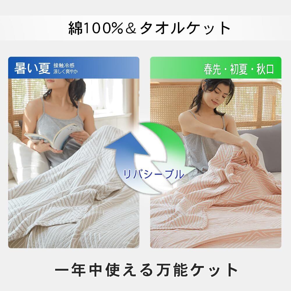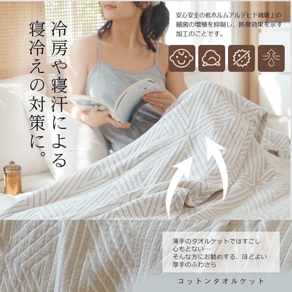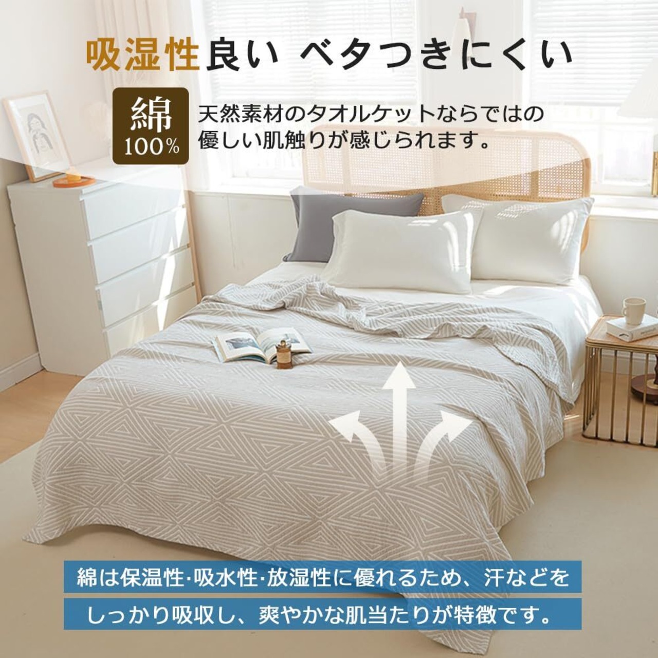 ●天然の綿素材:肌にやさしい綿100%素材で安心。天然素材のコットンを100%使用。 コットン糸は化学繊維に比べて繊維の端が丸く、優しい肌さわりが味わえます。 お肌のデリケートな方も安心してお使いいただけるタオルケットになりました。