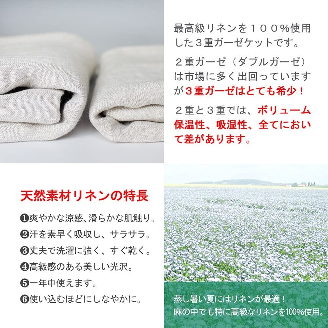表側、真ん中、裏側 全てリネン100%の糸で織り上げた3枚重ねの多重織りガーゼ構造です。 2重と3重では当然ボリュームが違い、その分、保温性の点でも吸湿性の点でも差が出てきますが、 市場に出回っているガーゼケットの大半はダブルガーゼで、3重ガーゼは大変希少です。 製造が難しいため、繊維の町愛知県三河の多重ガーゼ専門のメーカーに依頼して丁寧に加工しています。 リネン特有のシャリシャリとしたひんやり感があり、寝苦しい夜でも快適な使用感が味わえるケットです。 リネンは濡れると強度が増すため、繰り返しのお洗濯でもヘタレません。 また、洗濯を繰り返すほどにしなやかさが増し、肌にしっくりとなじむ風合いになっていきます。 汚れが落ちやすく乾きやすいので洗濯も簡単です。
