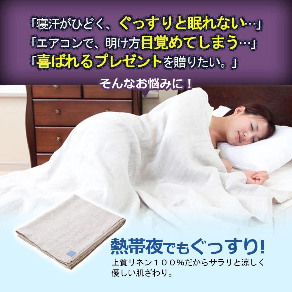 「寝汗がひどく、ぐっすりと眠れた気がしない・・・」 「暑くなるにつれ、布団を足元に蹴飛ばして寝冷えしてしまう。」 「エアコンをつけて寝て、明け方ひんやりして目覚めてしまう。」 「夏場は布団をこまめに洗濯したいけど、なかなか乾かない。」 「大切な方へ、喜ばれるプレゼントを贈りたい。」 夏の熱帯夜でもぐっすり! 上質リネン100%だから、サラリと涼しく、優しい肌ざわり。 3重に織り重なったリネンガーゼが冷えを防いで、朝までぐっすり熟眠できます。