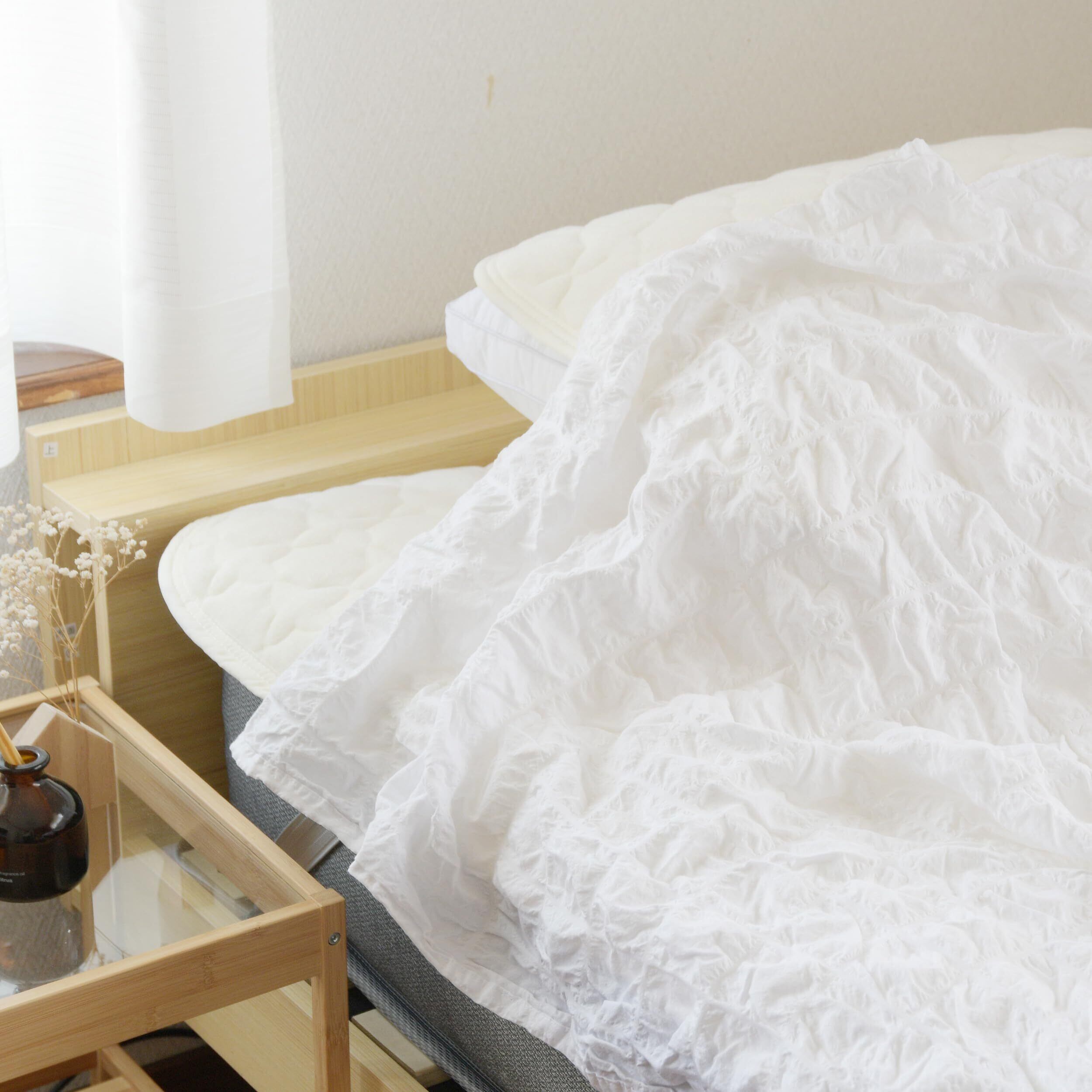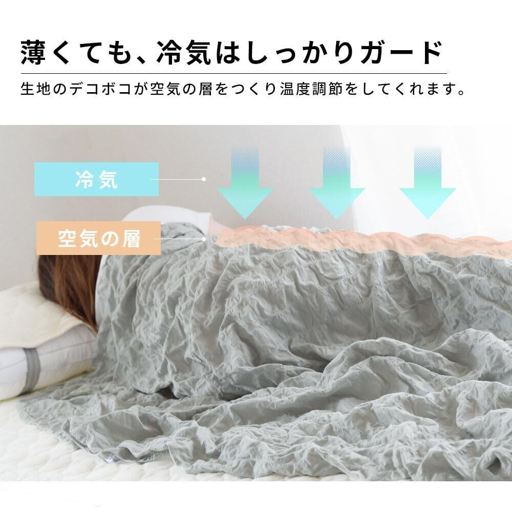 【肌への張り付き軽減】生地に凹凸がある為、肌に直接ふれる面積が少なくなり、汗ばむ夏でも張り付き感を抑えサラッと快適にお過ごしいただける肌掛け布団、ブランケットとなっております。