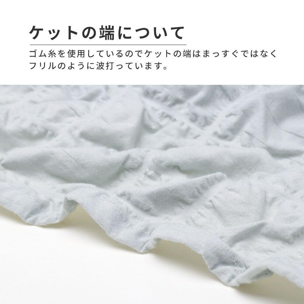 【どうしてデコボコ?】生地に格子状にゴム糸(ポリウレタン)を入れる事で縮みが生まれ、凸凹のある形状に仕上がります。使っているうちに凸凹が弱くなったように見える場合がありますが、ケットを大きく振っていただくことで適度に空気が入り凹凸が元通りになります。