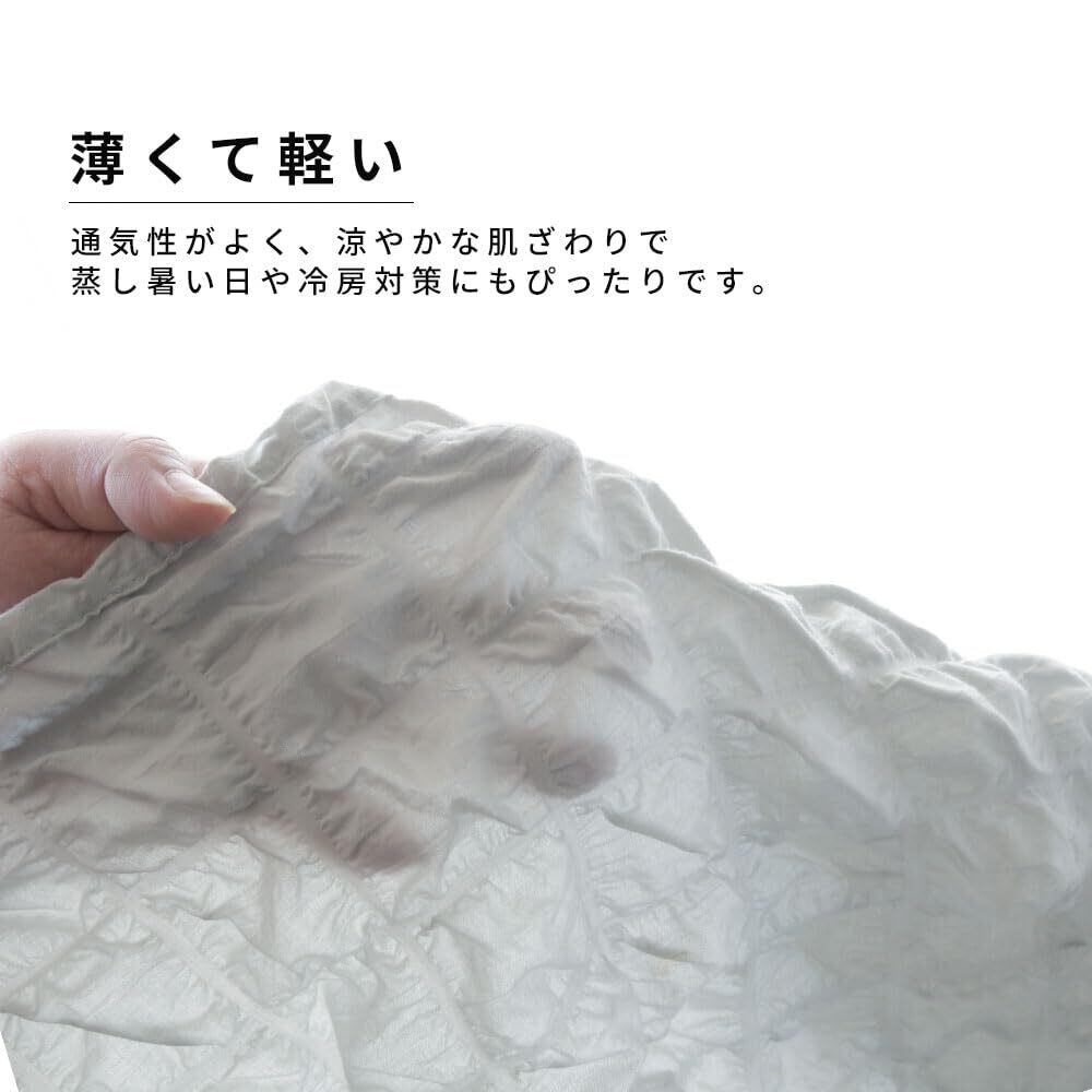 夏にぴったりの綿素材で作られています。軽くてくしゅくしゅしたデザインが特徴で、凹凸部分が適度な空気のポケットを作り、保湿性をキープします。肌に触れる面積が少ないので、肌への張り付き感を軽減し、冷房の冷たい風からも守ってくれます。素朴でやさしい天然繊維の風合いが心地よく、低刺激で敏感肌や赤ちゃんにも安心。