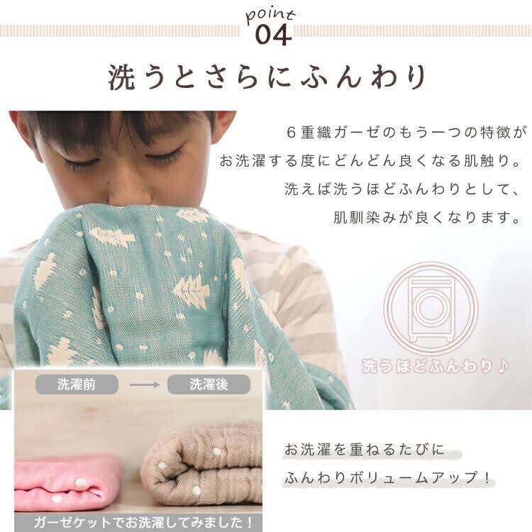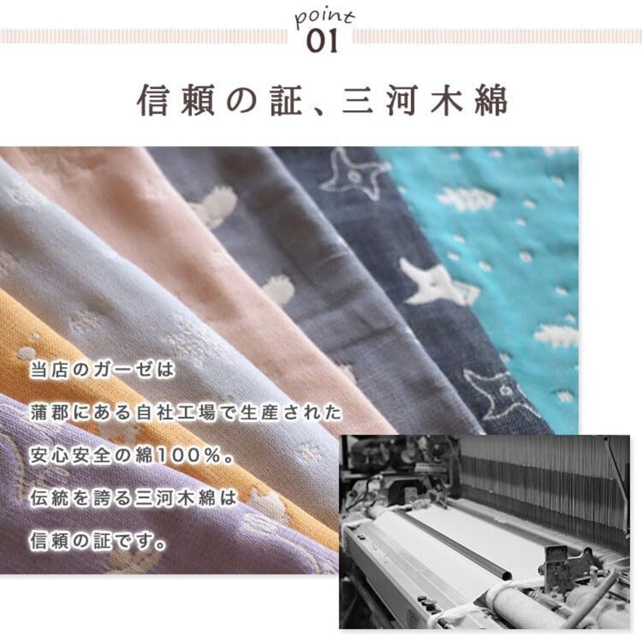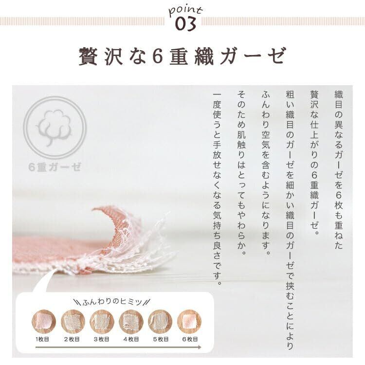 愛知県蒲郡市にある自社工場で生産された、綿100%の三河木綿を使い、ふんわりやわらかな6重織のガーゼケットに仕立てました。