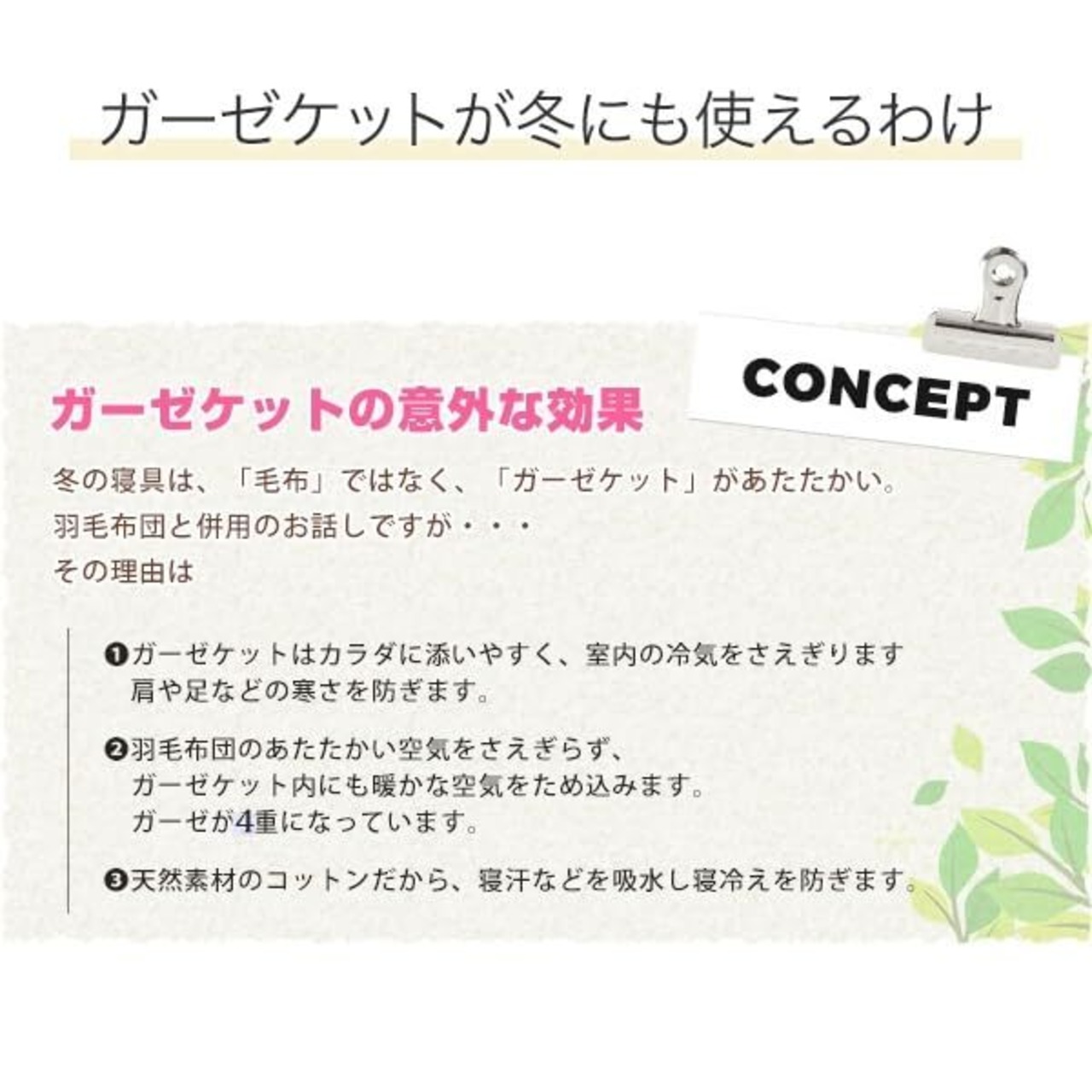 【夏はもちろん冬もお使いになれます】夏にはさわやかに、そして冬にはガーゼの間にあたたかい空気を含みからだにフィットするので、羽毛布団の中掛けとして使えば毛布いらずです。とても便利で重宝します。