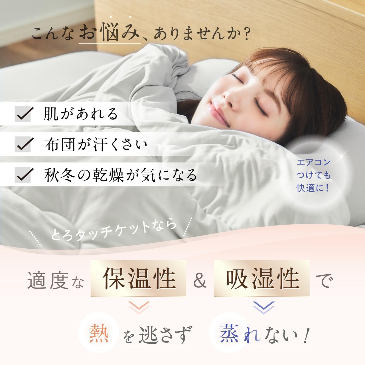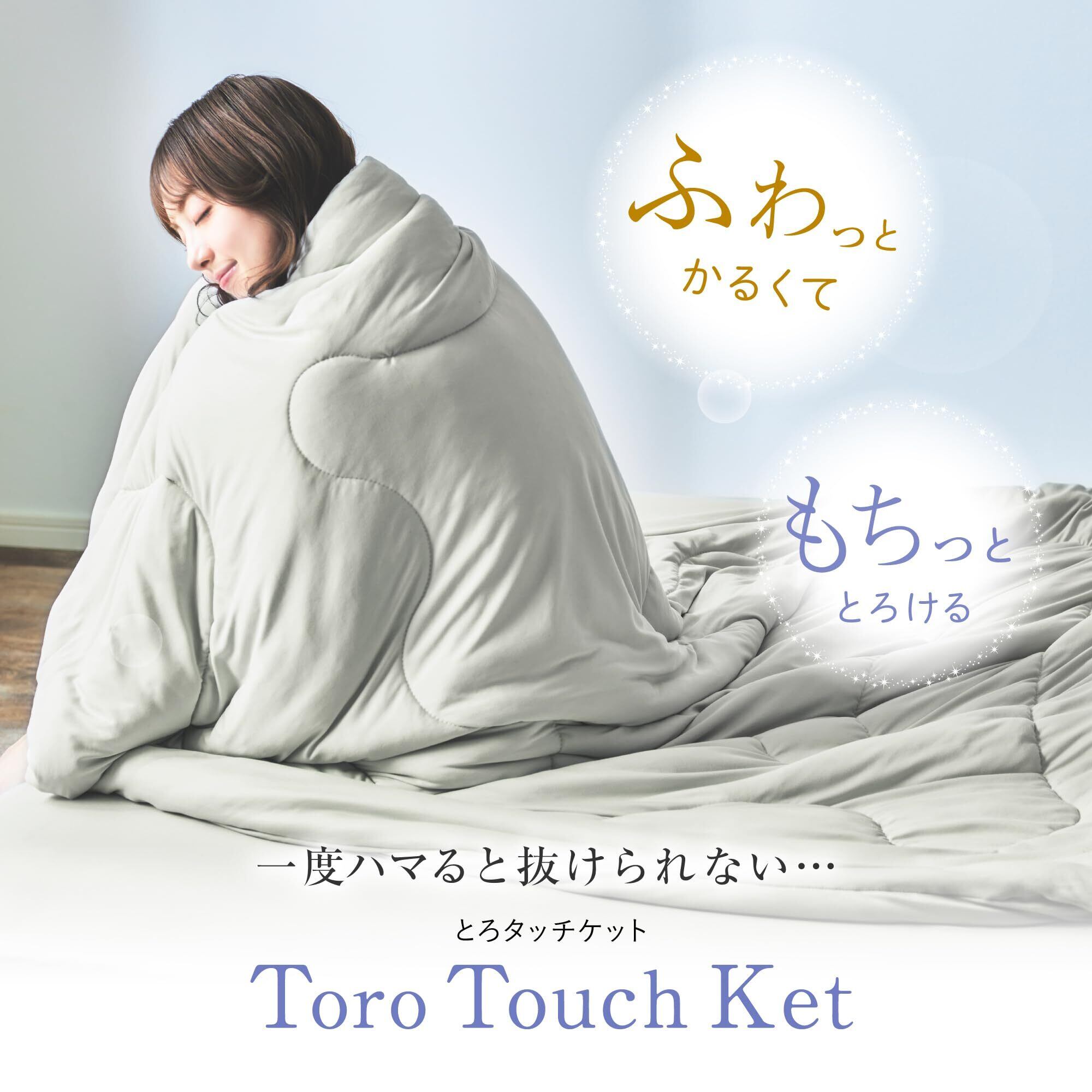 [新感覚のプレミアムキルケットが誕生!]雲に包まれているかのようなふわっふわの掛け心地。かと思えばもちっととろけるような‟ぬめり感“。様々な感触を1枚に詰め込んだ「とろタッチケット」が遂に誕生!その秘密は、特別加工で従来ない触り心地を実現した「とろタッチ生地」と極細繊維にグレードアップした「超極細プレミアム中綿」のW効果。保温性・通気性・透気性など機能性が高く、冬は温かく、夏はサラッと快適に使えます。また感触は至極ゴージャスなのに中身がタフなのも、この製品の魅力の一つ。洗濯機で日常的にクリーニングできるため、手間要らずで便利!