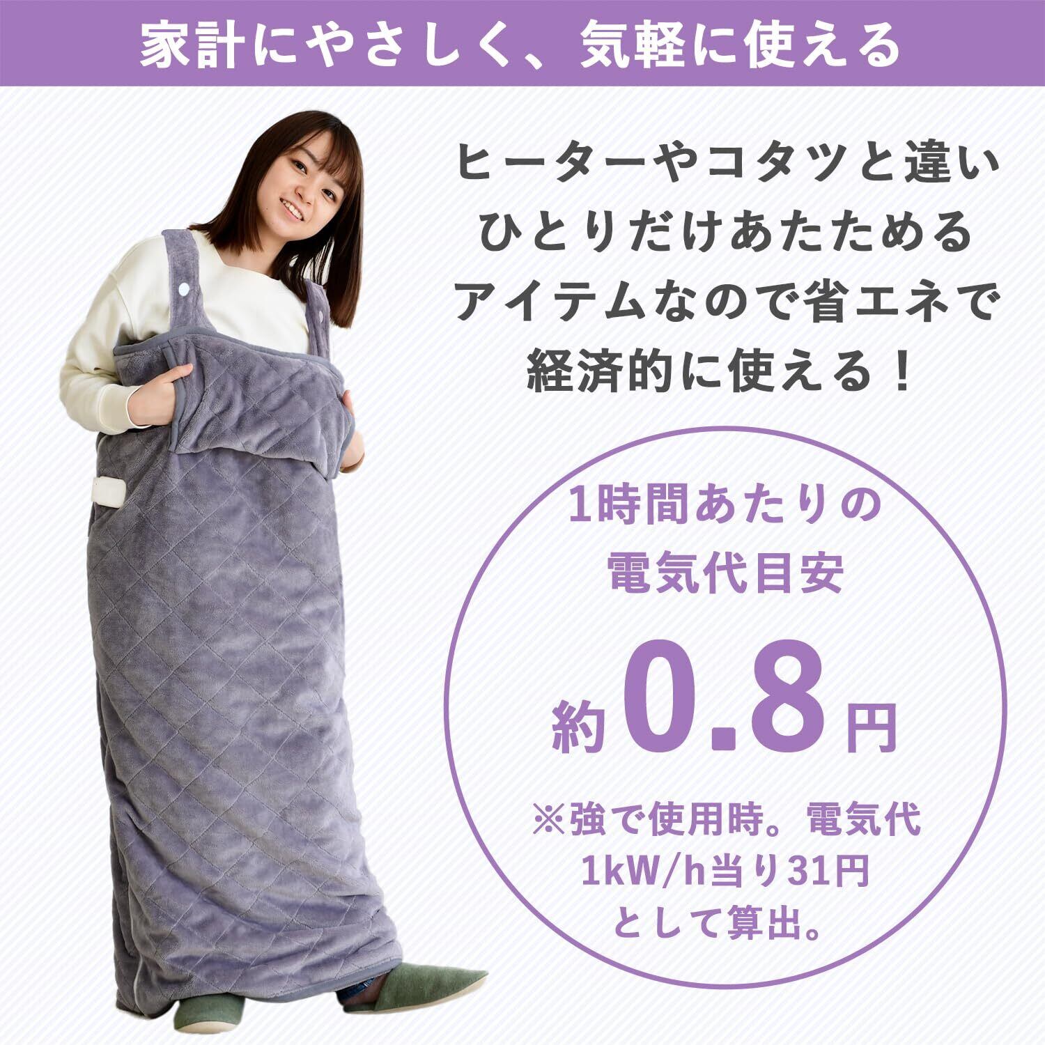 【省エネ】ヒーターやコタツと違い、ひとりだけあたためるアイテムなので省エネで経済的です。電気代は1日8時間使用した場合約6.4円で1ヶ月だと約192円とお財布にやさしく、気軽にお使いいただけます。