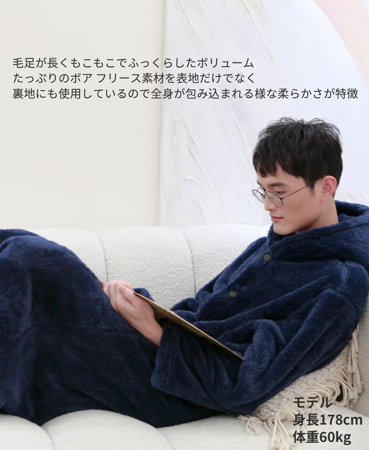 [Yoimira] 着る毛布 男女兼用 大きいサイズ 暖かい フード付き ルームウェア メンズ 着る 毛布 レディース 部屋着 ボタン付 秋冬 洗える 乾きやすい (L-着丈125cm)