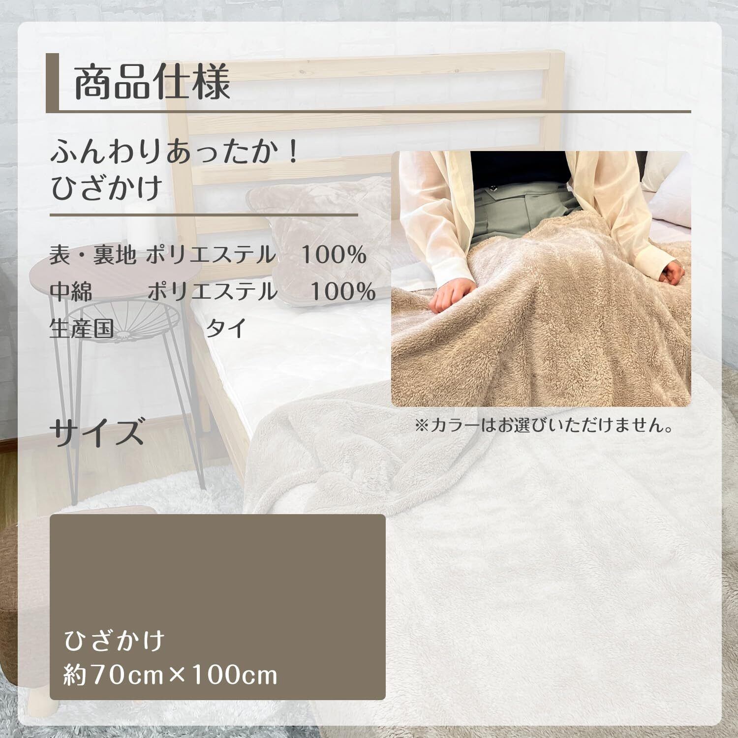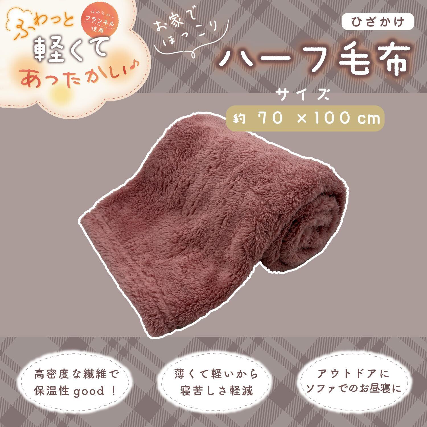 【商品名】あったか ハーフケット 【商品サイズ】約100cm×140cm(±3%の誤差がある可能性がございます) 【カラー】アイボリー,ベージュ,ブラウン 【素材】表地:ポリエステル100% 【生産地】タイ