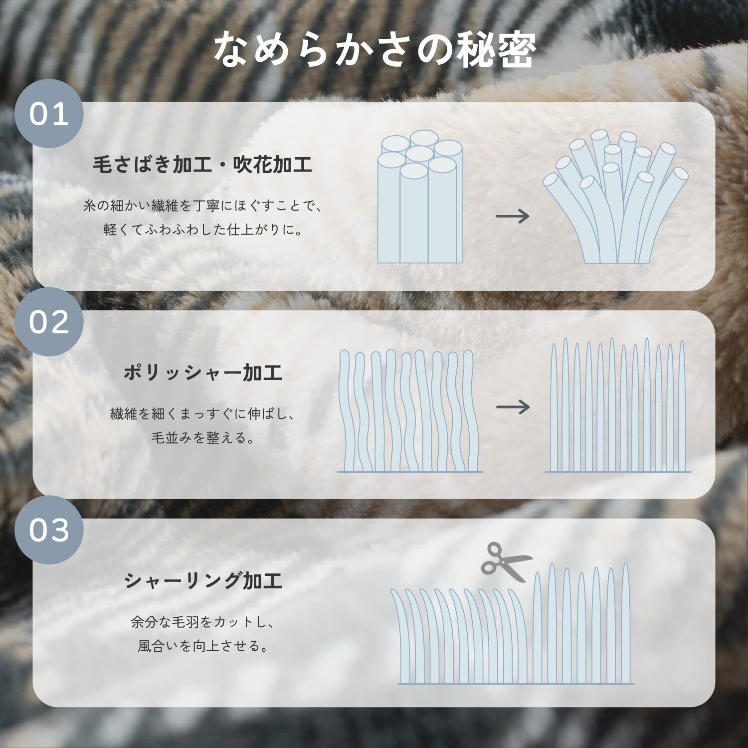マイヤー織りを使用したブランケット。細い糸を高密度で織り込んだ耐熱性に優れた素材です。