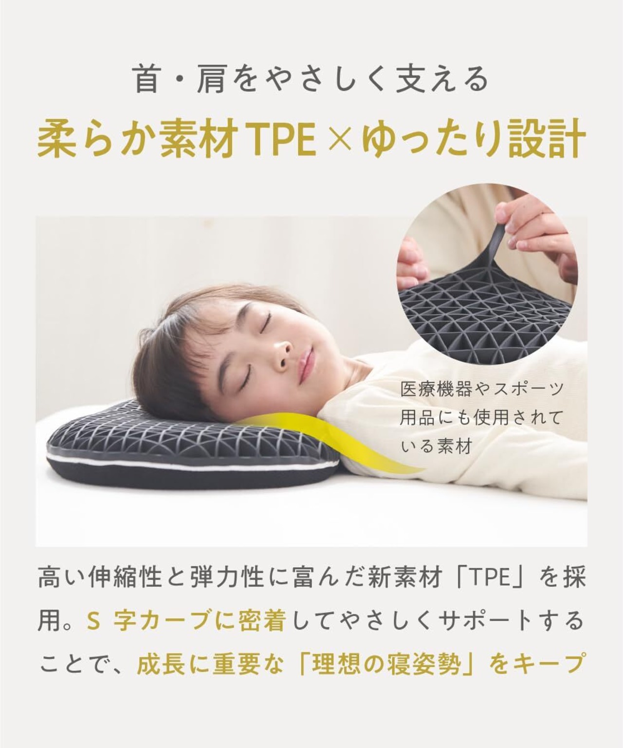 【柔らか素材TPE】 子供用枕 の素材には弾力性に富んだ新素材「TPE」を採用。 枕 によって成長に必要な「理想の寝姿勢」をキープします
