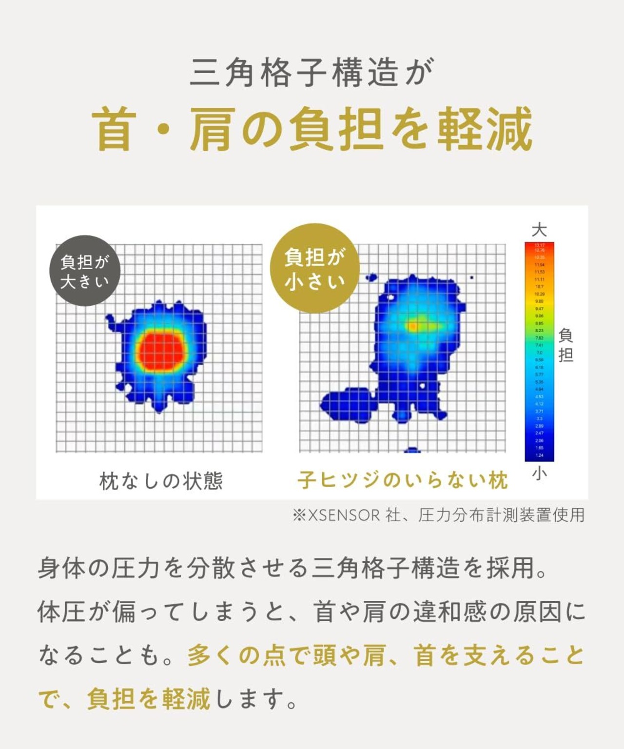 【首・肩の負担を軽減】身体の負担を軽減する「三角格子構造」を採用。 枕 の多くの点で頭や首・肩を支えることで、負担を軽減します