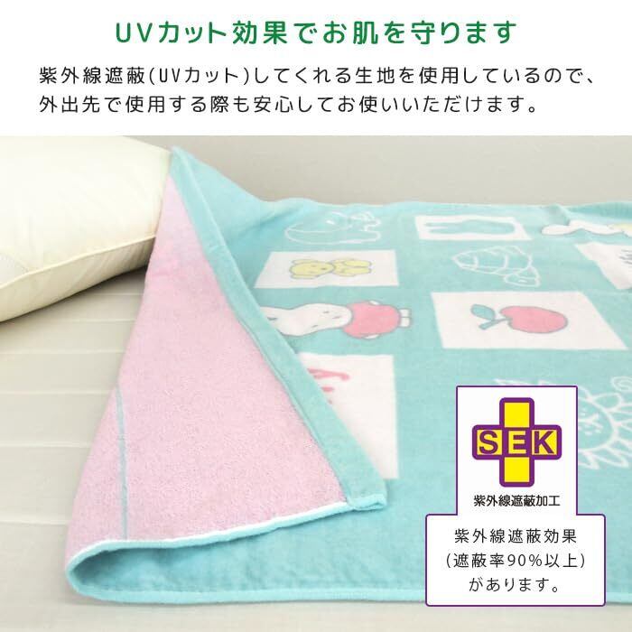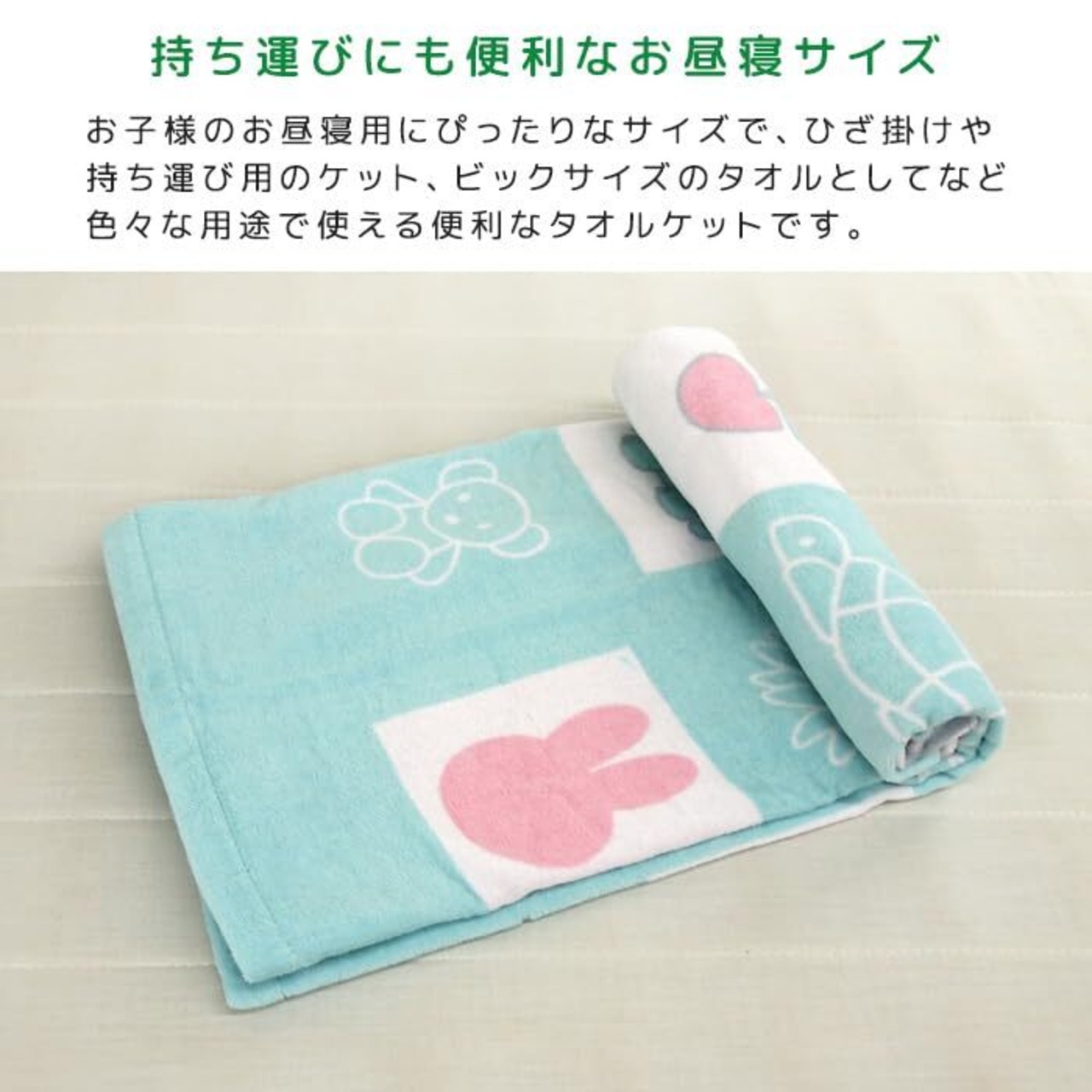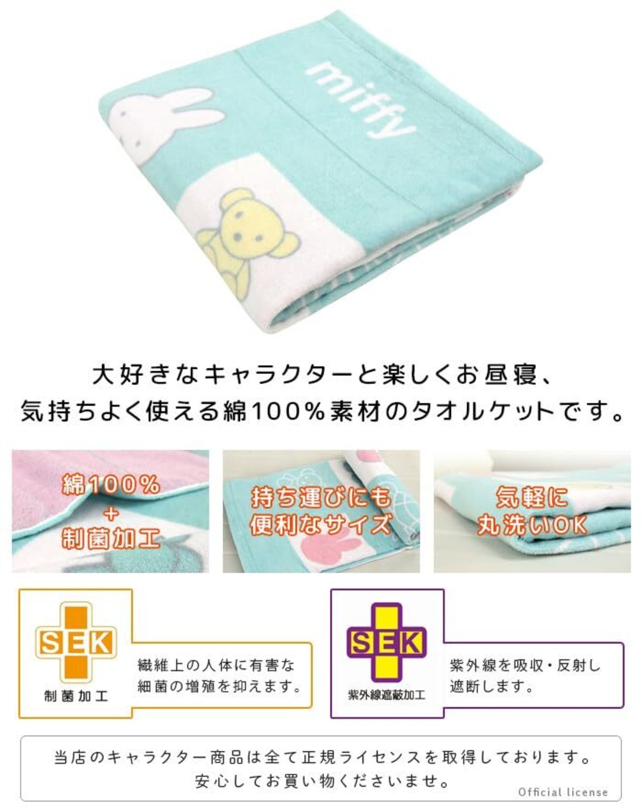 お子様のお昼寝にピッタリのタオルケット/ミッフィーのかわいいデザイン。肌にやさしい綿100%素材、表地はシャーリング加工し気持ちいいなめらかな肌さわりです。繊維に付着した菌の増殖を防ぐ"制菌加工"をプラスしました。コンパクトサイズで持ち運びも簡単、レジャー・アウトドアなど色んな場面で活躍してくれる便利なタオルケットです。