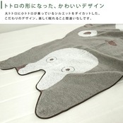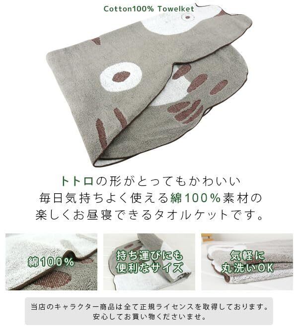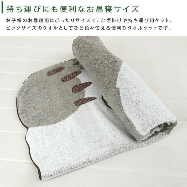 お子様のお昼寝にピッタリのタオルケット/となりのトトロの楽しいデザイン。なめらかで優しい肌触りの天然素材"綿100%"を使用。大トトロに小トトロが乗っているシルエットをかたどった、こだわりのデザイン。コンパクトサイズで持ち運びも簡単、レジャー・アウトドアなど色んな場面で活躍してくれる便利なタオルケットです。