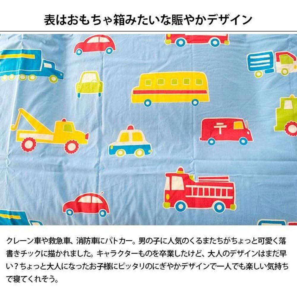 日本国内に自社縫製工場を持つカバーリング専門縫製メーカーによる、子ども用ジュニアサイズの掛け布団カバーです。表はおもちゃ箱みたいな賑やかデザイン!クレーン車や救急車、消防車にパトカー。男の子に人気のくるまたちがちょっと可愛く落書きチックに描かれました。表が賑やかな分、お布団をめくった時にちらりと見える裏地はシンプル無地に。素材はもちろんお肌にやさしい天然素材の綿100%の生地で、吸汗性にも優れています。YKK社の全開ファスナーで開閉スムーズ、出し入れしやすい!さらに、カバー内側にはお布団を固定できるボタン付き紐が付いています。パチっととめるだけなのでお子様でもラクラクもちろん、ご家庭の洗濯機で丸洗いOK!