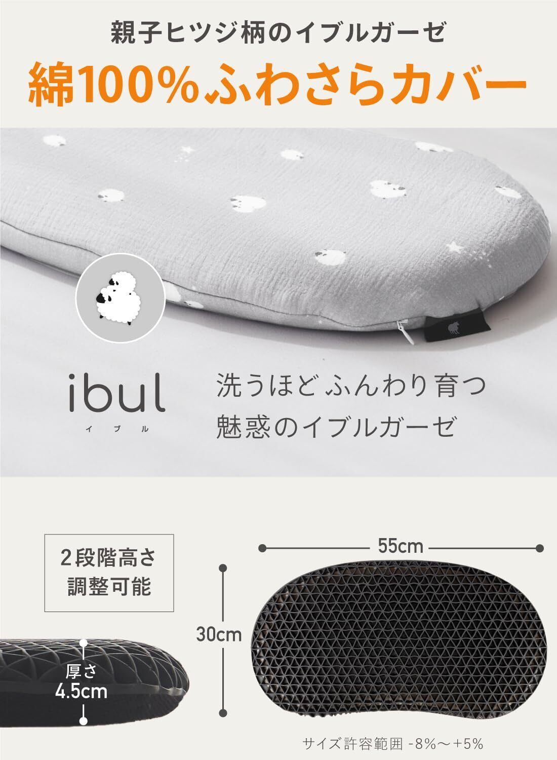 【寝返りスムーズ設計】体圧分散性に優れた三角格子構造で頭・首・肩の圧力を分散し、スムーズな寝返りを実現します。また首元をカーブ設計にすることで寝返りしたときの首や肩にフィット。ゴムのような柔軟性で形状を変えるので寝返りしてもフィットし続け、常にベストな支えをキープします。55cmの十分な横幅で寝返りして頭が落ちてしまうこともなく朝まで快眠 【綿100%ガーゼのふんわり枕カバー】4重ガーゼのふんわりやわらか枕カバー付き。キュートな親子ヒツジが快眠を見守ります。