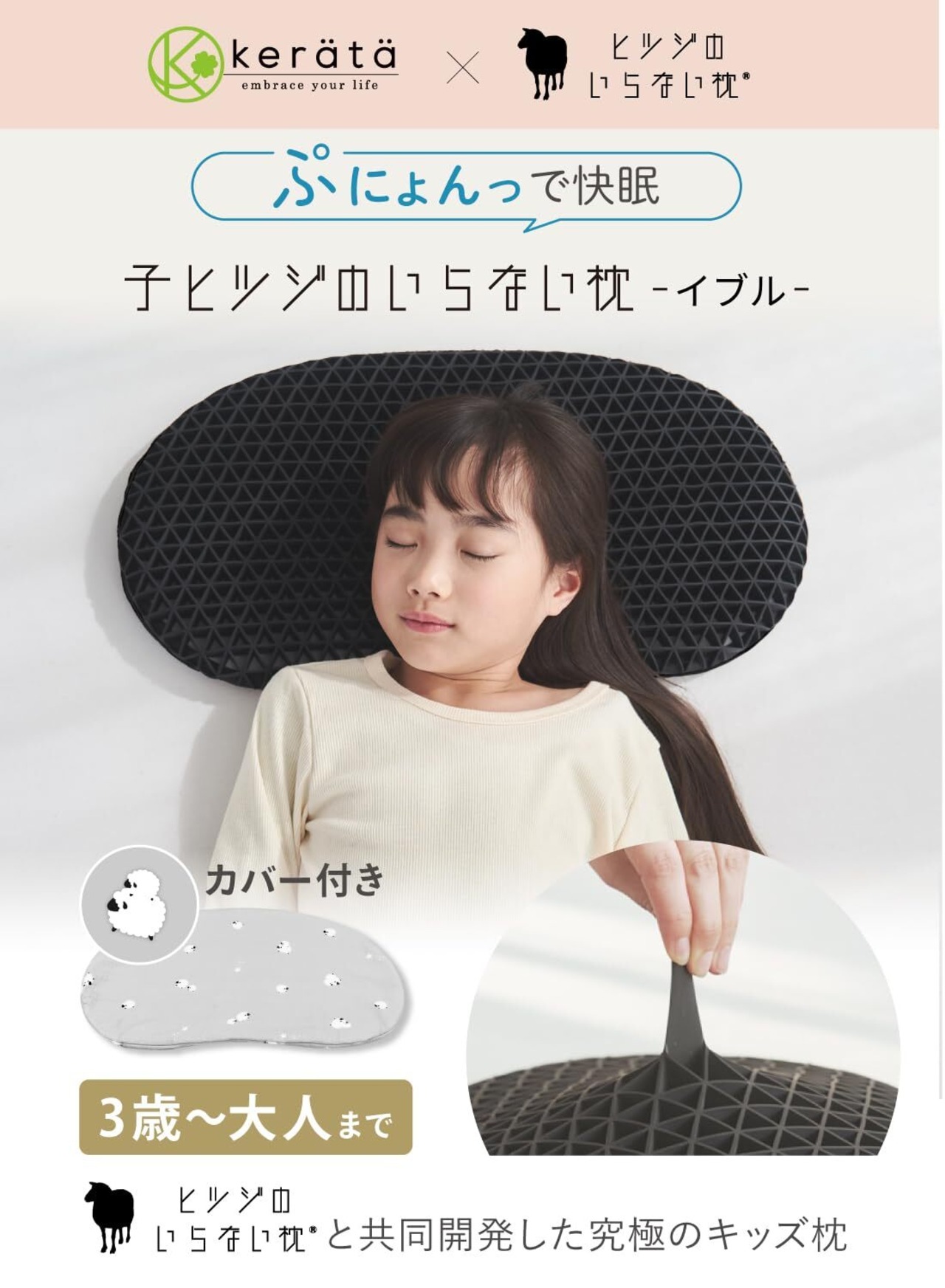 シリーズ累計販売数60万個突破!ヒツジのいらない枕と共同開発した究極のキッズ枕「子ヒツジのいらない枕」。子どもにとって成長するうえで重要な睡眠環境。睡眠環境を枕でサポートします。ぷにょんぽにょんのやわらか素材(TPE)で頭にフィット、寝返りもスムーズに支えます。成長に合わせて高さ調節もできるため、3歳~低め枕がお好みの大人まで長く使えます。