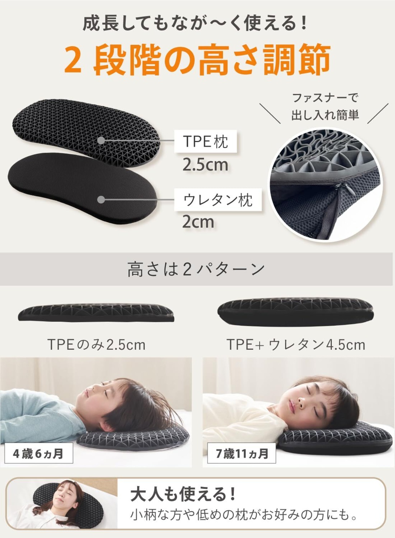 【成長してもなが~く使える】枕本体のTPEの下にウレタン枕を装着することで成長に合わせて2段階に高さ調節が可能です。2.5cm~4.5cmに調節ができるので3歳~低めがお好みの大人まで長く使えます◎枕本体のTPEは耐久性に優れているので10年経っても変わらない寝心地を実現(10年間の寝返り想定した圧力試験実施)
