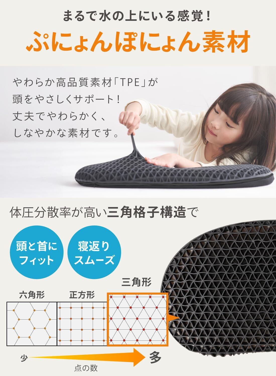 【ぷにょんぽにょん素材が頭にフィット】やわらかなTPE(熱可塑性エラストマー)素材を採用。丈夫でやわらかく、しなやかな素材で頭をやさしくサポートします。 【通気性抜群!朝までスッキリ快眠】実は子どもの汗の量は大人の2倍近く!なので眠っている間に汗で服やシーツ、髪の毛がびっしょり濡れてしまうことも。汗をかきやすい子どもが快適に眠れるよう、枕本体は熱や湿気を通しやすい「三角格子構造」眠っている間の熱や湿気を逃して朝までスッキリ。 【丸洗い可能で清潔】枕本体もカバーも丸洗いOKなので毎日清潔にご使用いただけます。また、枕本体には消臭性のある活性炭を配合。寝汗や湿気によるイヤなにおいも吸着し防ぎます。