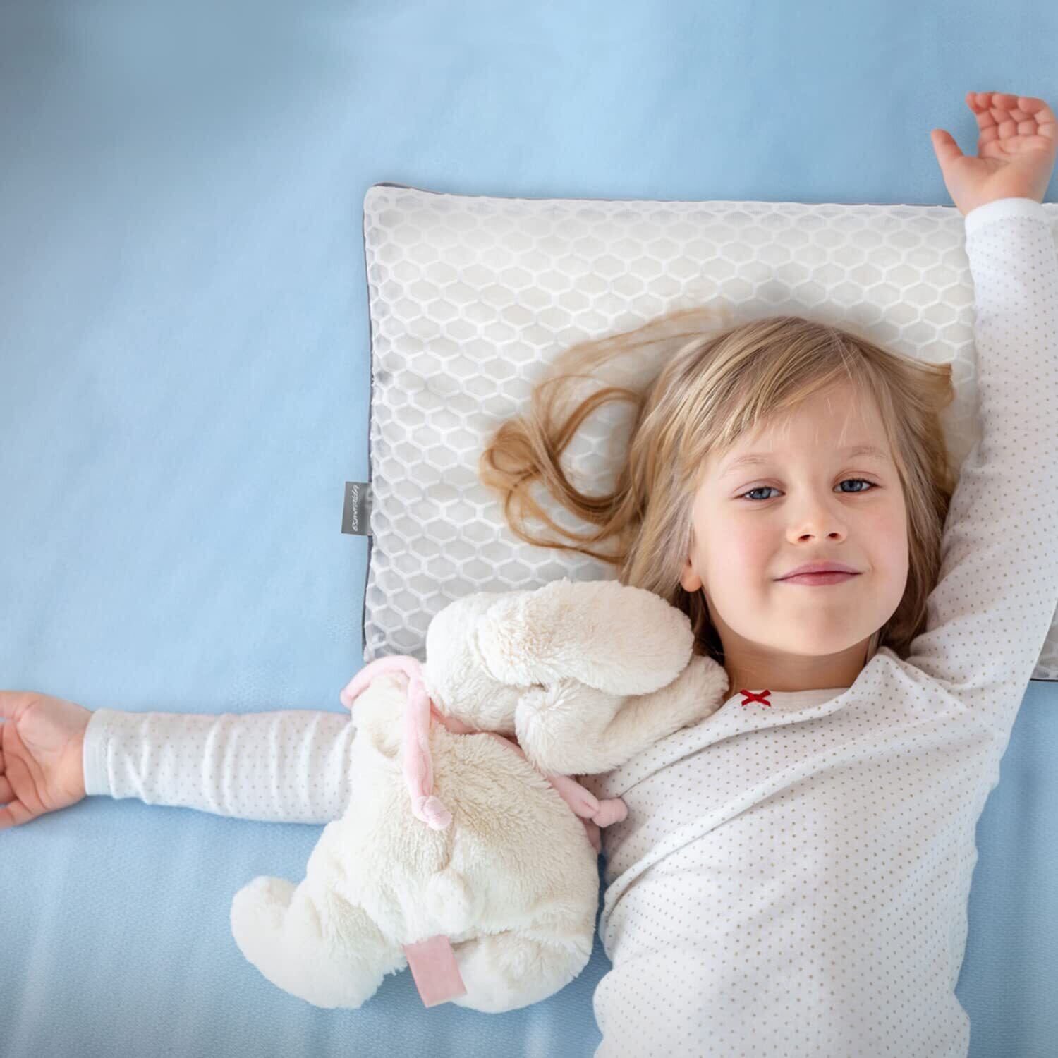 【子どもの成長に欠かせない「質の良い睡眠」をサポート】成長ホルモンは睡眠中に分泌されるため、正しい姿勢で眠れる枕選びが大切。EsmeraldAは、乳幼児期の枕に続き、小学生向けの専用枕を開発。