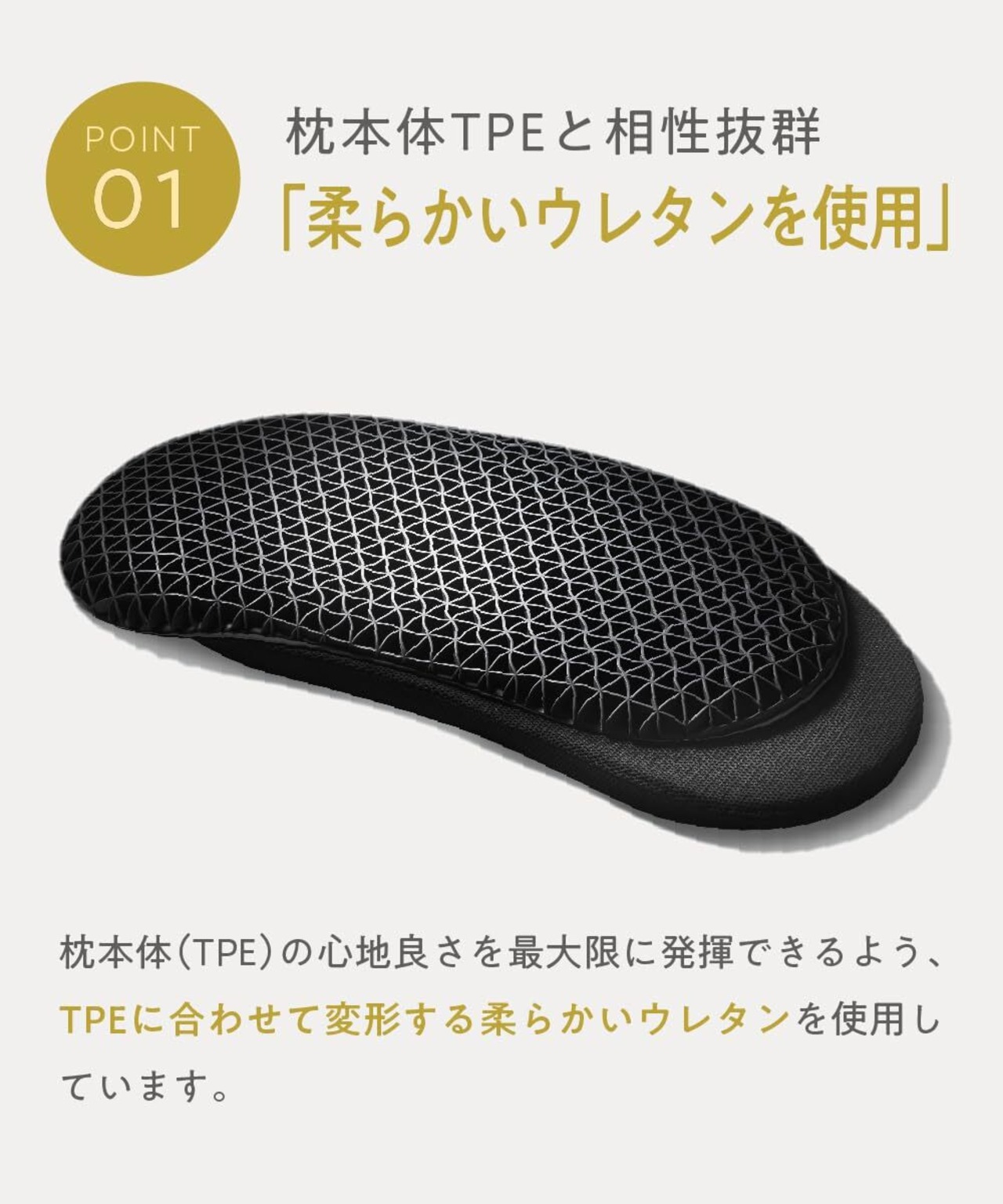 【 枕 本体TPEと相性抜群、柔らかい ウレタン 】 枕 本体(TPE)の心地良さを十分に発揮できるよう、TPEに合わせて変形する柔らかいウレタンを使用しています