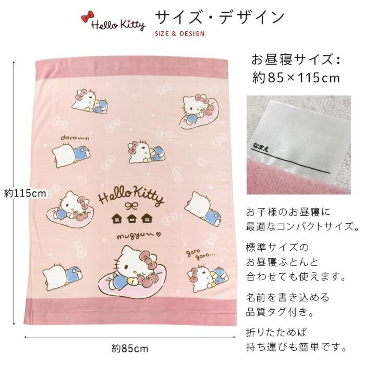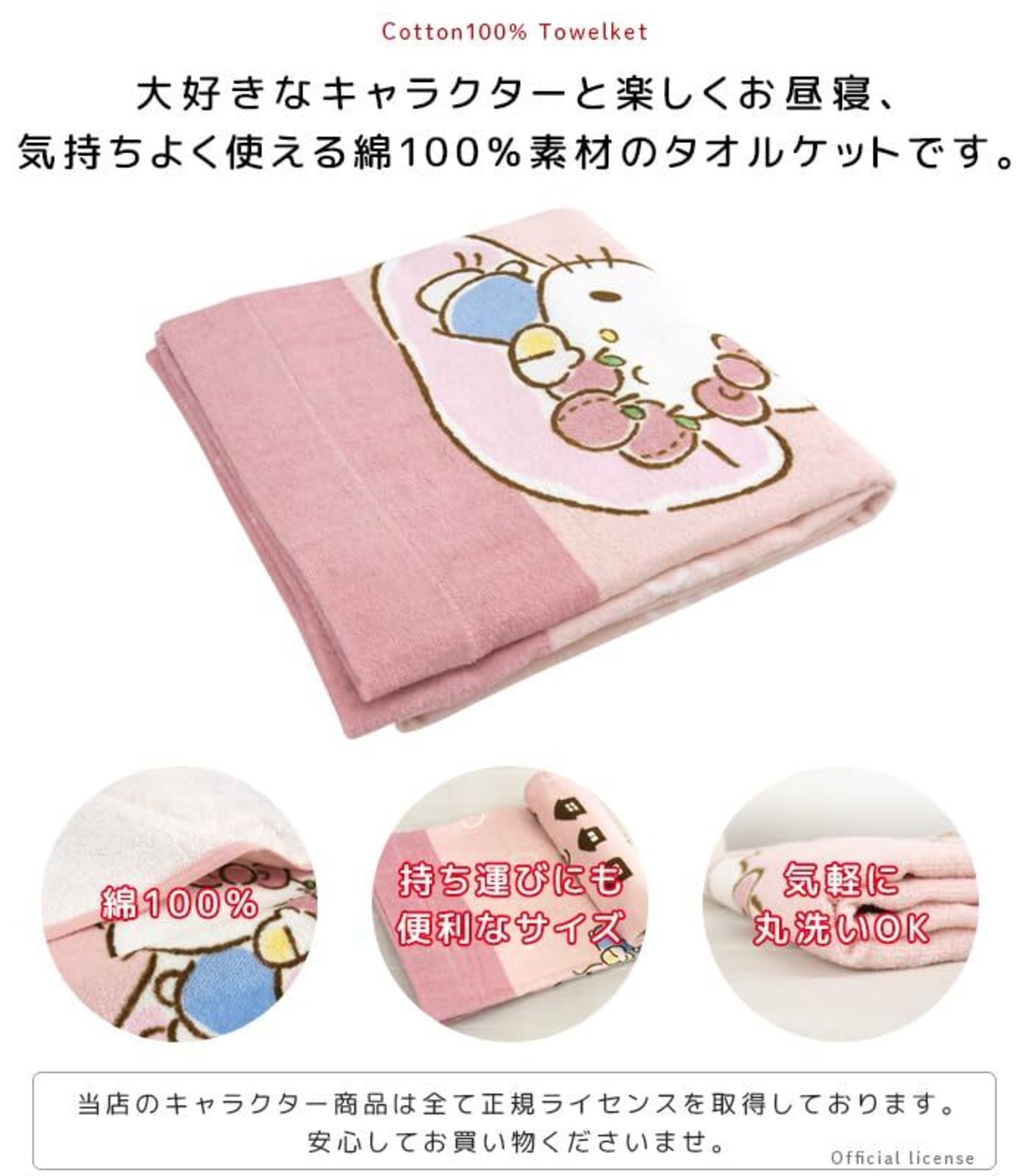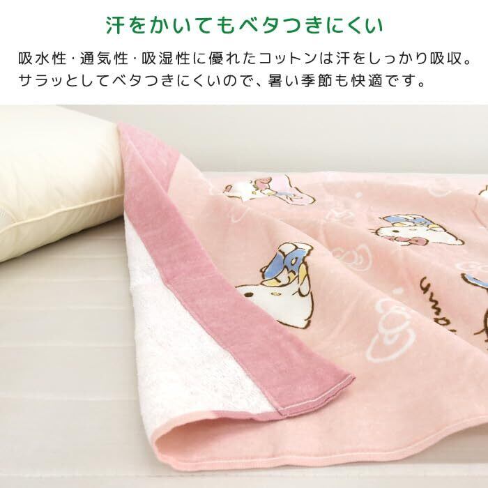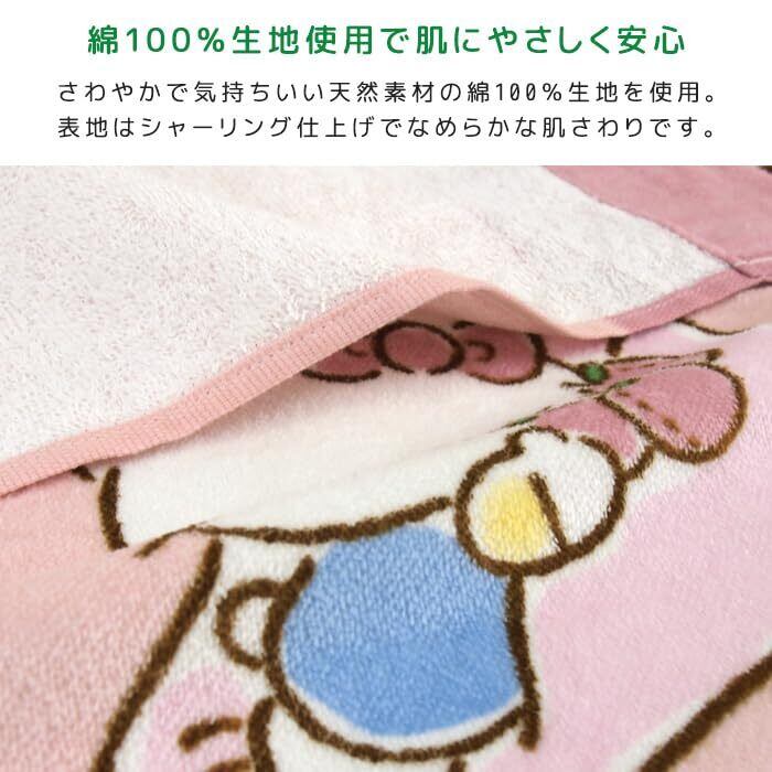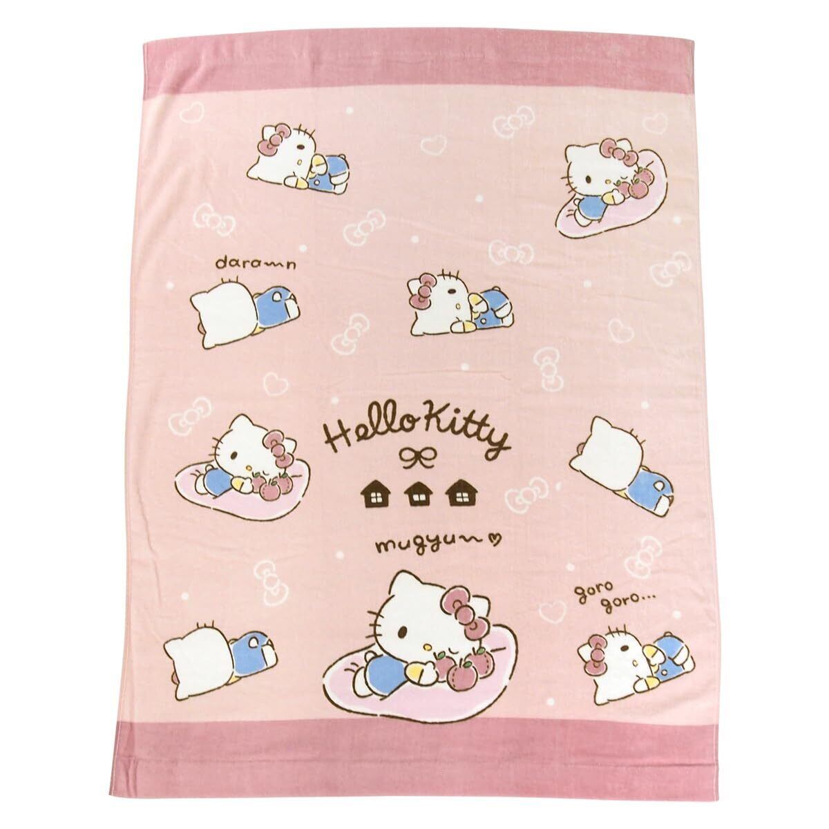お子様のお昼寝にピッタリのタオルケット/ハローキティのかわいいデザイン。肌にやさしい綿100%素材、表地はシャーリング加工し気持ちいいなめらかな肌さわりです。 コンパクトサイズで持ち運びも簡単、レジャー・アウトドアなど色んな場面で活躍してくれる便利なタオルケットです。