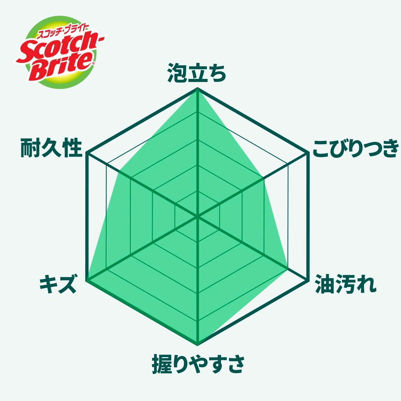 バランスの良い2種類のウレタンスポンジを使用することでたっぷり泡が立ちます。研磨粒子を含まない不織布を使用しているので、泡でやさしく食器や調理器具を洗うことが出来ます。従来品よりも淡いパステルカラーにすることで、やさしく泡立ちの良いイメージを表現しています。モノトーンカラーを追加し、3色での展開となります。