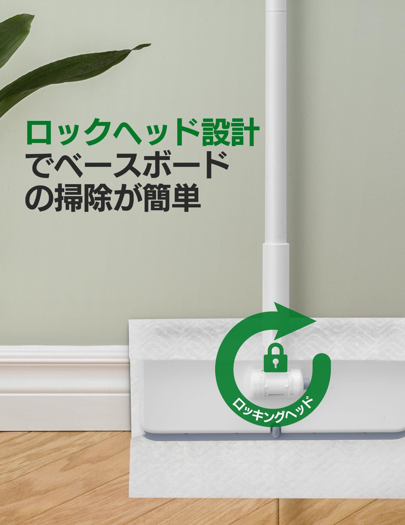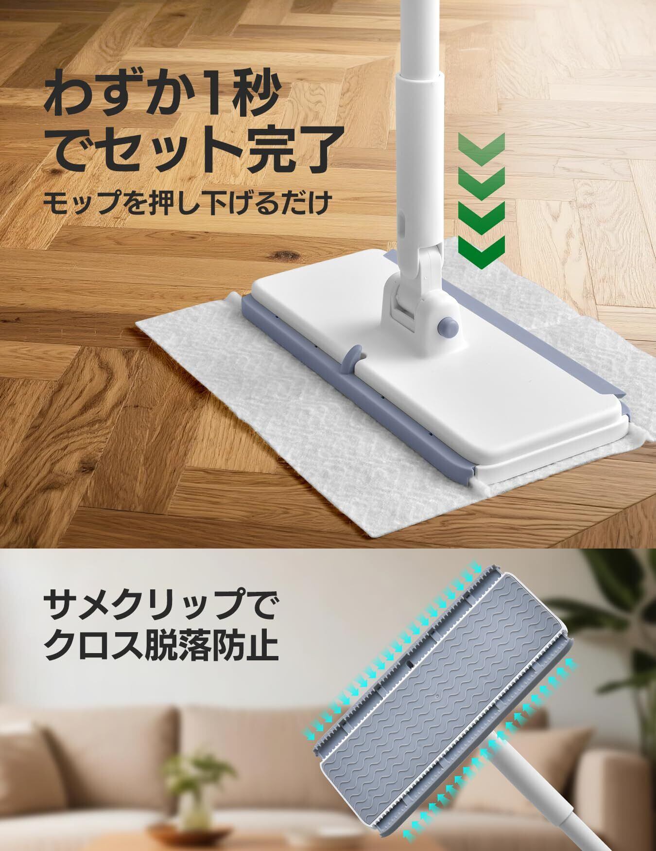 1秒でモップパッドを取り付け、しっかり固定:緩んだり滑ったりするモップパッドとはお別れしましょう。改良されたサメの歯のようなクリップ設計により、パッドは押すだけで所定の位置に固定されます。一般的なフローリングワイパーでは得られない安定性を実現します