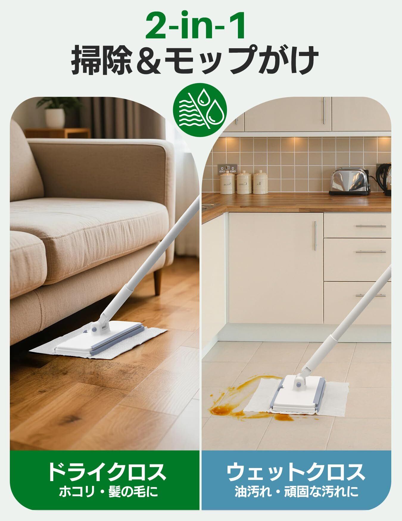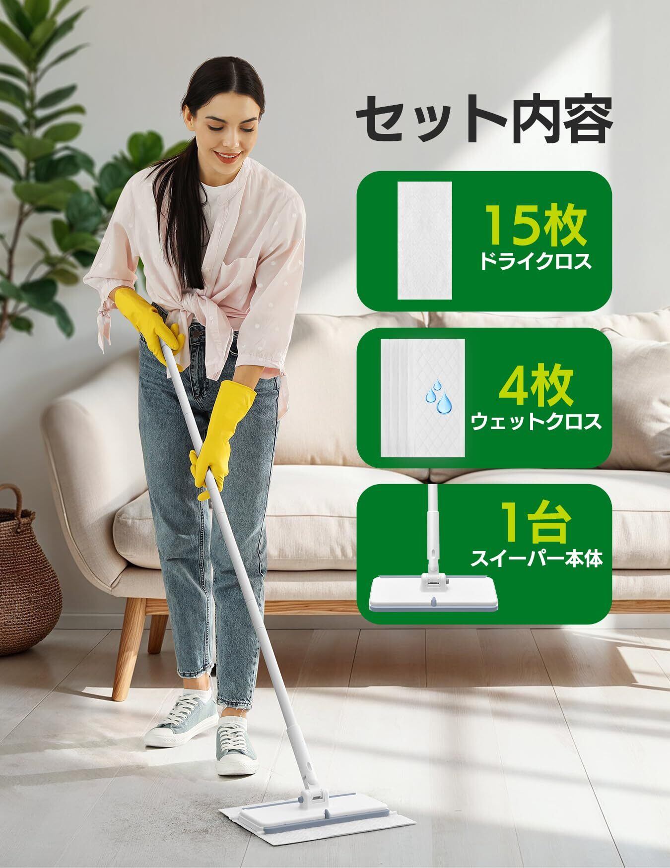 2イン1のドライ&ウェットクリーニングツール、素早く効率的:この革新的なくいつくるわいぱー本体は、静電ドライスイープパッドでほこりや髪の毛をキャッチし、ウェットパッドで頑固な汚れも一掃。フローリングワイパーとモップの機能を兼ね備えた一台二役の便利さです