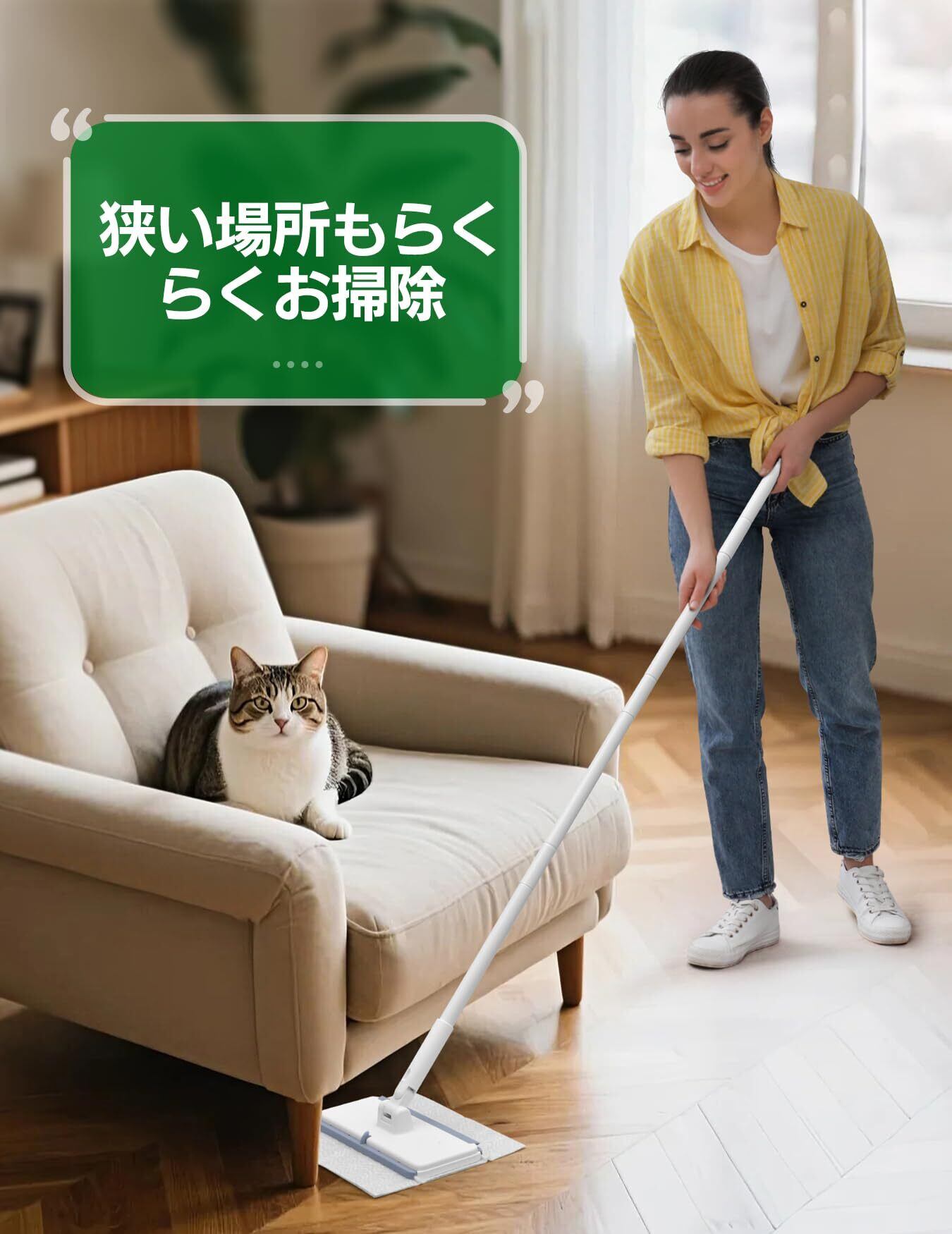 調節可能なハンドルとロック式ヘッドであらゆる作業に対応:64cm〜117cmの高さ調節ができ、家具の下の掃除や高所の窓掃除も楽々。モップの使いやすさをさらに進化させました
