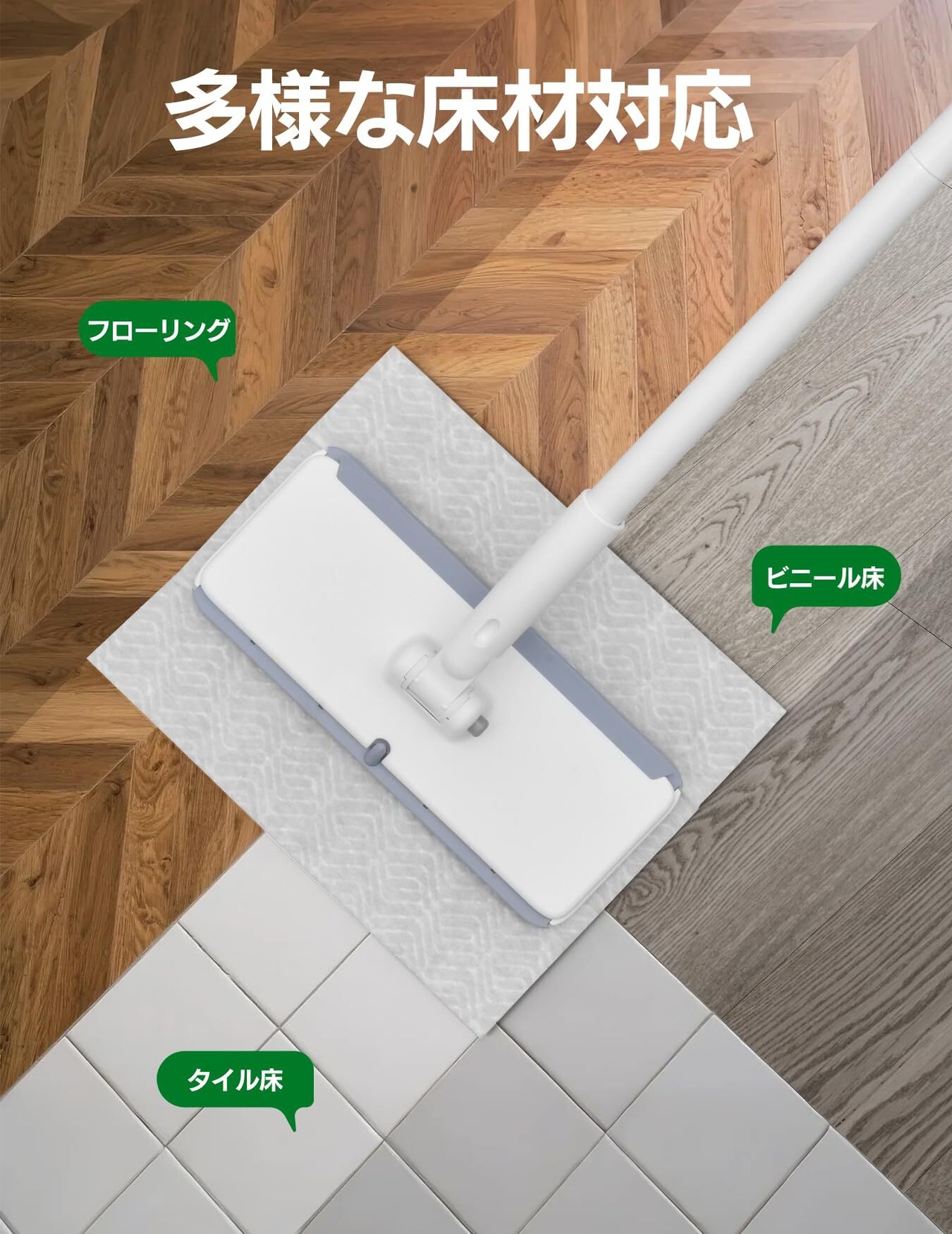 あらゆる床タイプに幅広く対応:タイル、堅木、ビニール、ラミネートなど、さまざまなフローリングに対応可能。キッチンやバスルームはもちろん、リビングなど日常の清掃に最適なフローリングワイパーです