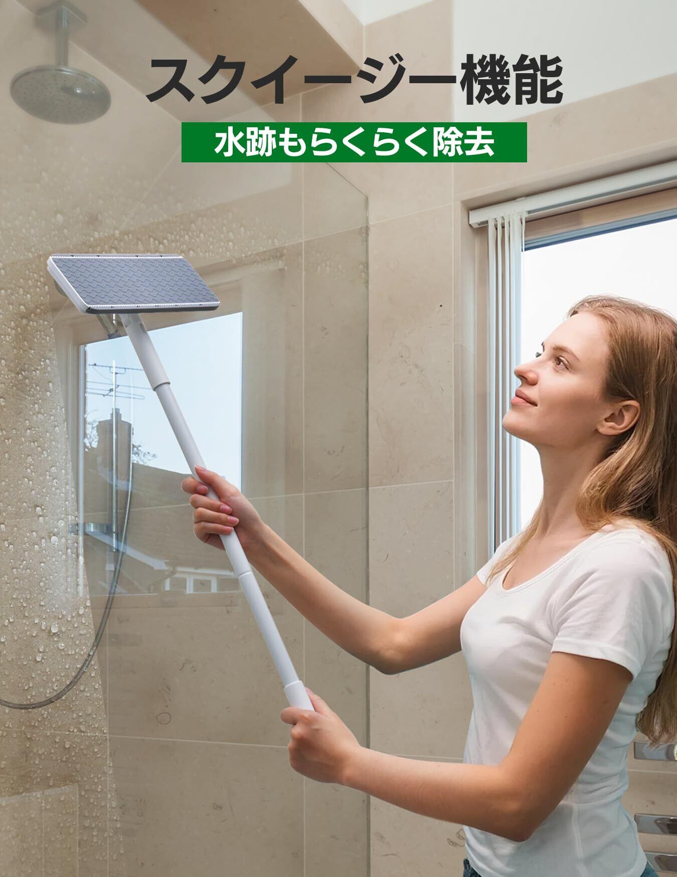 ウォータースクイジー搭載で跡残りなし:ガラスやタイルに残る水滴や石鹸跡も、シリコン製スクイジーでさっと一拭き。クイックルワイパーのような表面清掃では届かないところまで対応