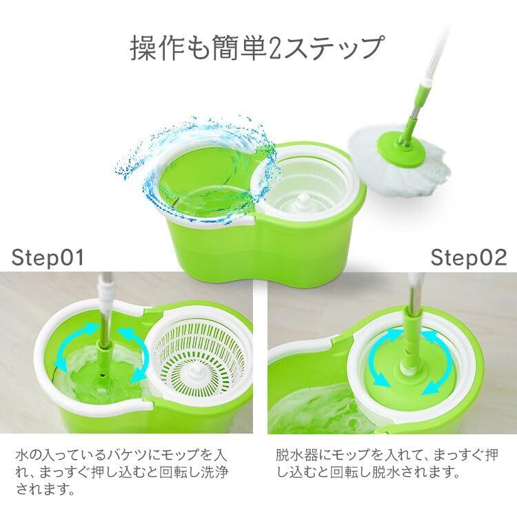 もう手は汚さない!ダブル回転で洗浄×脱水!超カンタンもうペダルを踏む必要がありません。モップを上下させるだけで回転します。モップ部分はマイクロファイバー!!小さなゴミやホコリなどの汚れがよく取れ吸水・脱水性も抜群!!ベッドの下の隙間やエアコンの上の部分など、お掃除しにくい所や外窓、天井など、いろいろな場所・シーンに大変便利なお掃除グッズです!