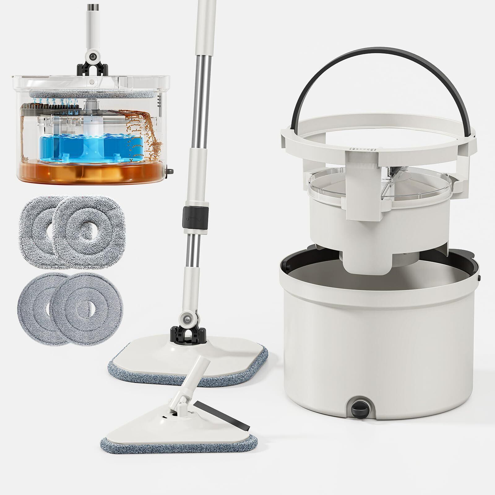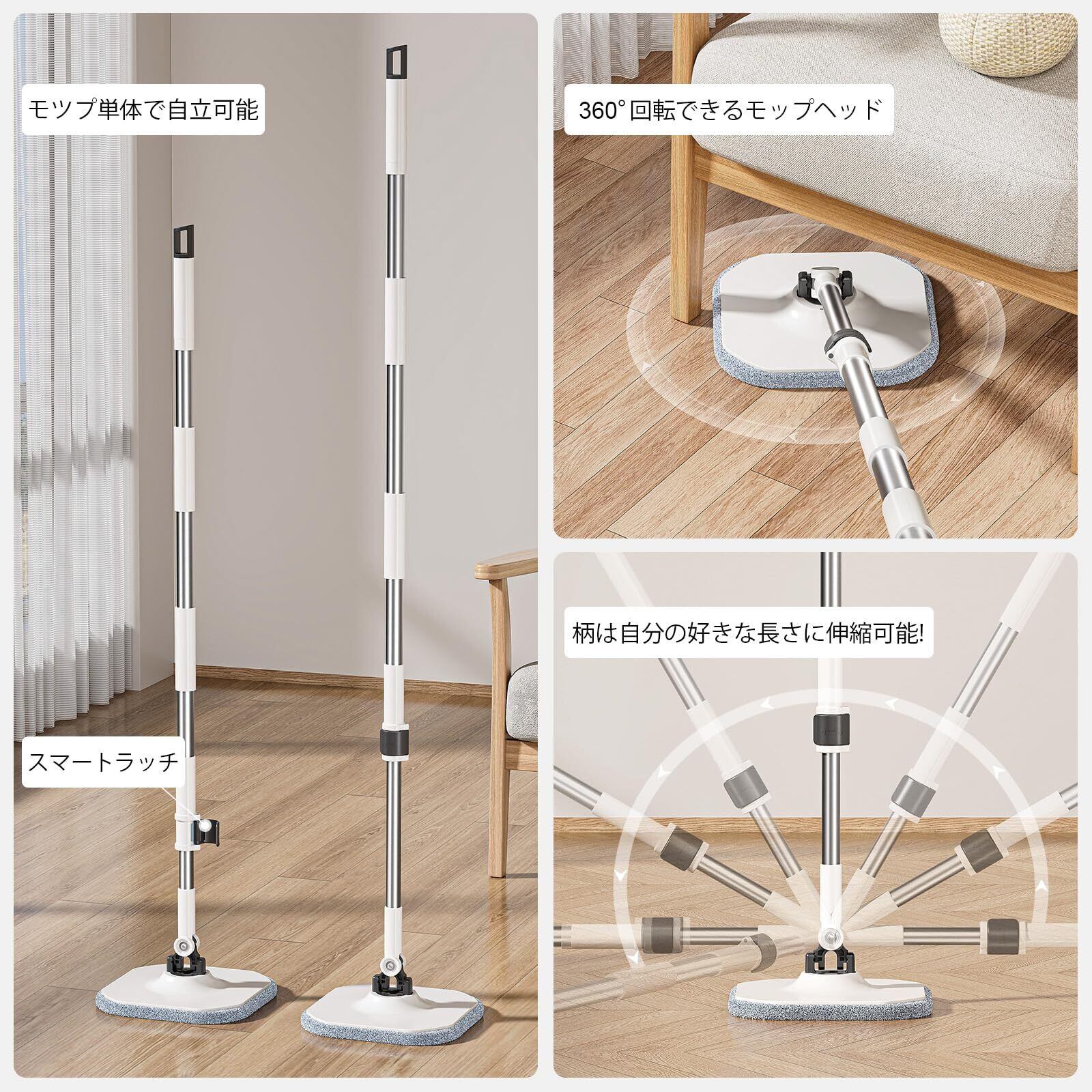 HoMettler 回転モップ 汚水分離式モップ 水拭き/乾拭き対応 節水設計 スクイージー付き三角ヘッド付き 掃除 軽量 床に優しい 長さ調節 二層式 洗浄 脱水 丸型&角型替えモップ4枚+三角クリーナー 省スペース収納 モップ