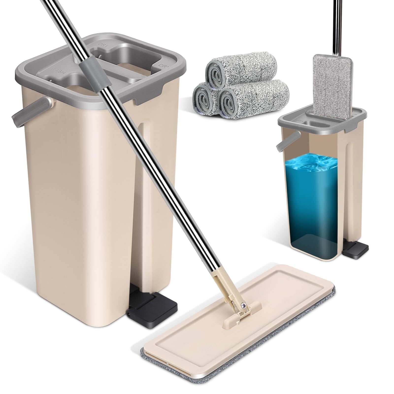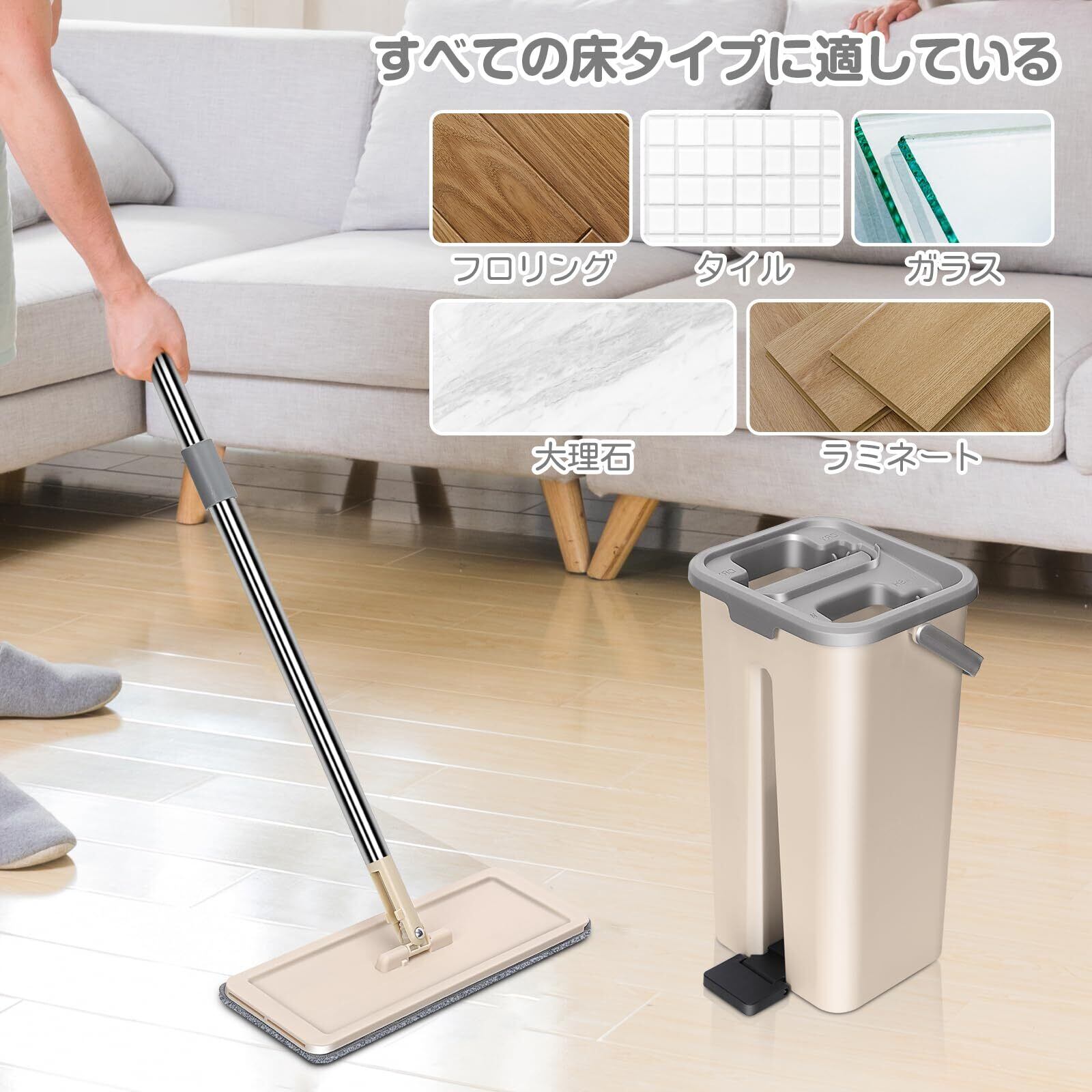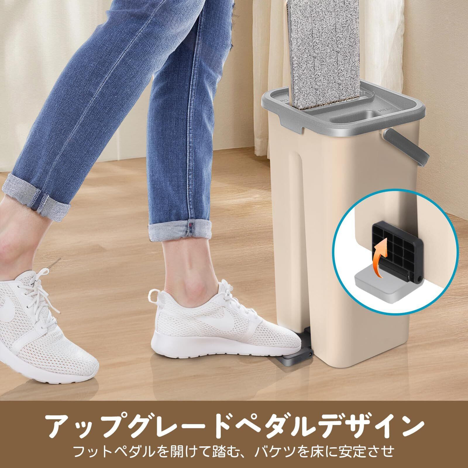 ZNM モップ バケツ 絞り器セット フロアモップ 乾湿両用 水拭きモップ フロリングワイパー 床掃除 軽量 360°回転 手洗い不要 3枚マイクロファイバーパッド付き ベージュ