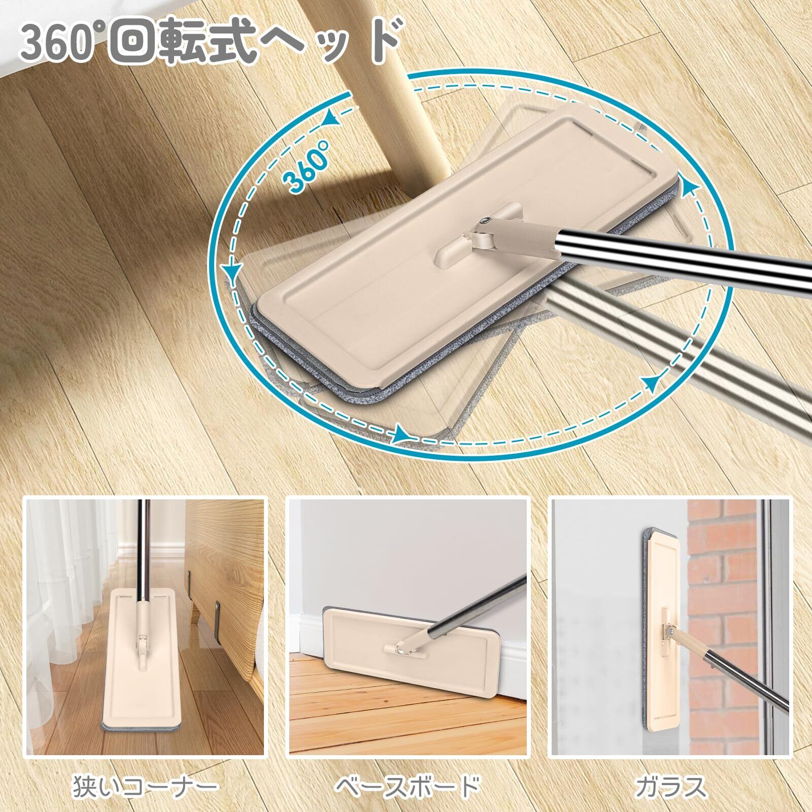 360°フリー回転モップ:どんな狭い隙間や家具の下もラクラク掃除!360度回転で手元の操作が軽く、床の隅々まで汚れをキャッチします。