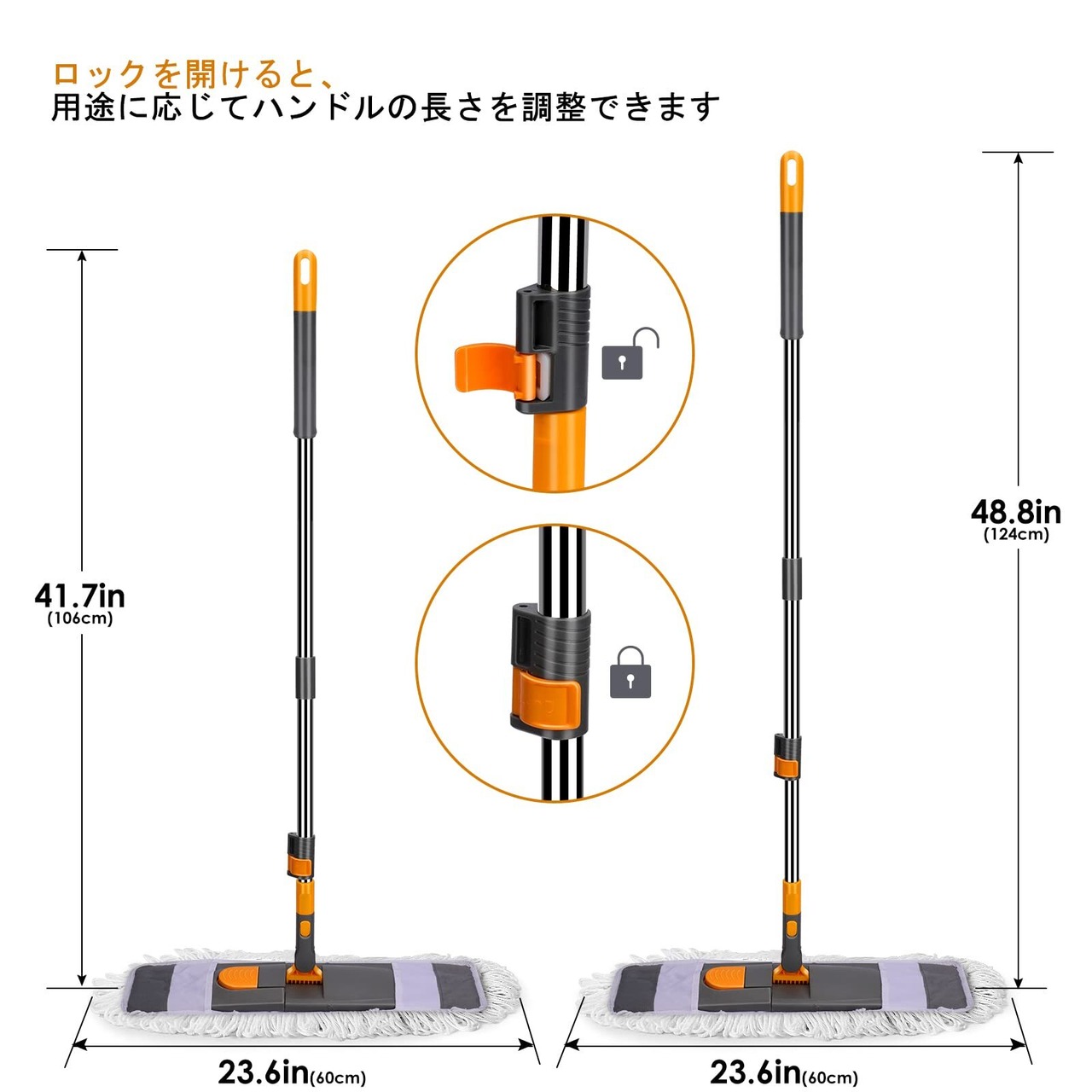 【リトラクタブルハンドル】マイクロファイバーモップのハンドルは、ロックを開けるだけで106~124cmの間で好きな長さに調節できるロック機構を備えています。 身長の異なる方にも最適です。